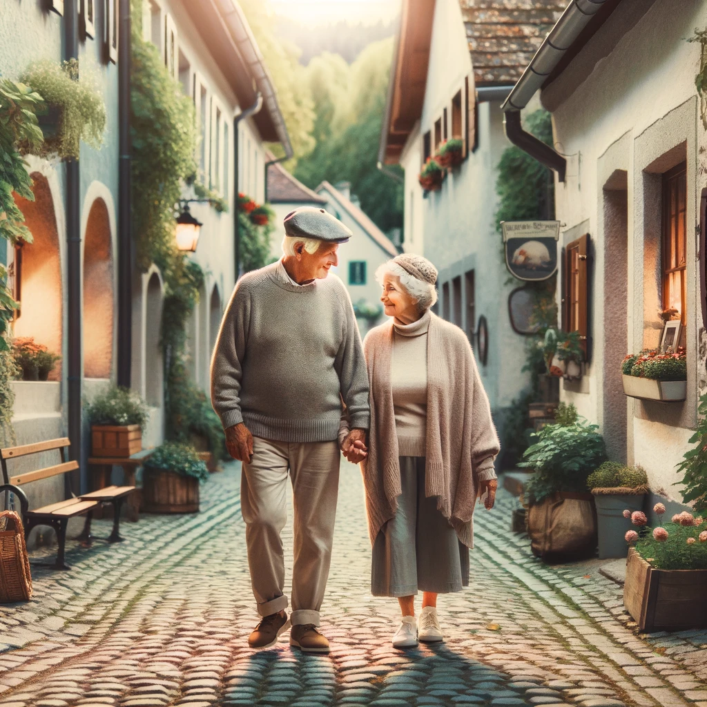 As the sun sets, casting a warm, golden glow over the cobblestone street, an old couple strolls hand in hand. Their steps are slow, but their love is steadfast and unwavering. The serene setting whispers tales of enduring companionship, painting a portrait of timeless love etched in the gentle embrace of twilight.