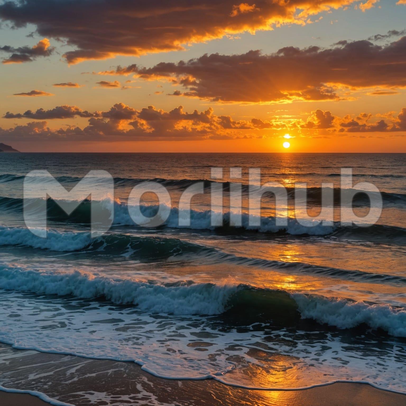 The tides move steadily toward the shore, their surface shifting with each rhythmic motion. The horizon stretches far, where the sun lowers, casting a soft transition across the sky. Wisps of clouds drift above, delicate and scattered. The water reflects the changing light, its surface carrying hints of the sky’s fading glow. The waves roll in patterns, advancing and receding in an endless cycle. The distant horizon remains still as the tides continue their steady motion, shaping the shoreline with each passing moment.