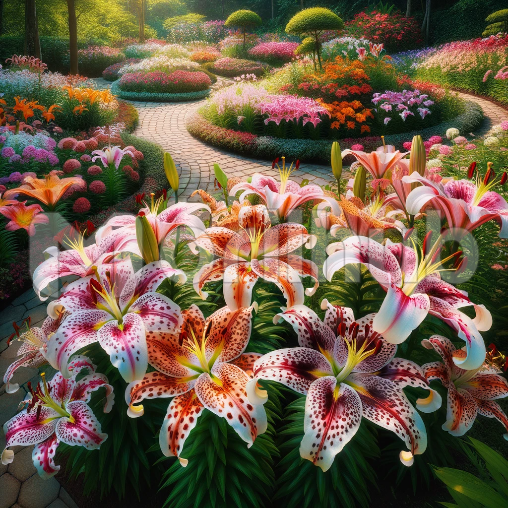 In this enchanting garden scene, a tapestry of nature unfolds with resplendent Oriental lilies in full bloom. Their grand, vibrant petals boast an array of colors, adorned with a captivating pattern of spots that resemble delicate constellations. These elegant lilies stand as living masterpieces, a testament to the intricate artistry of the natural world.