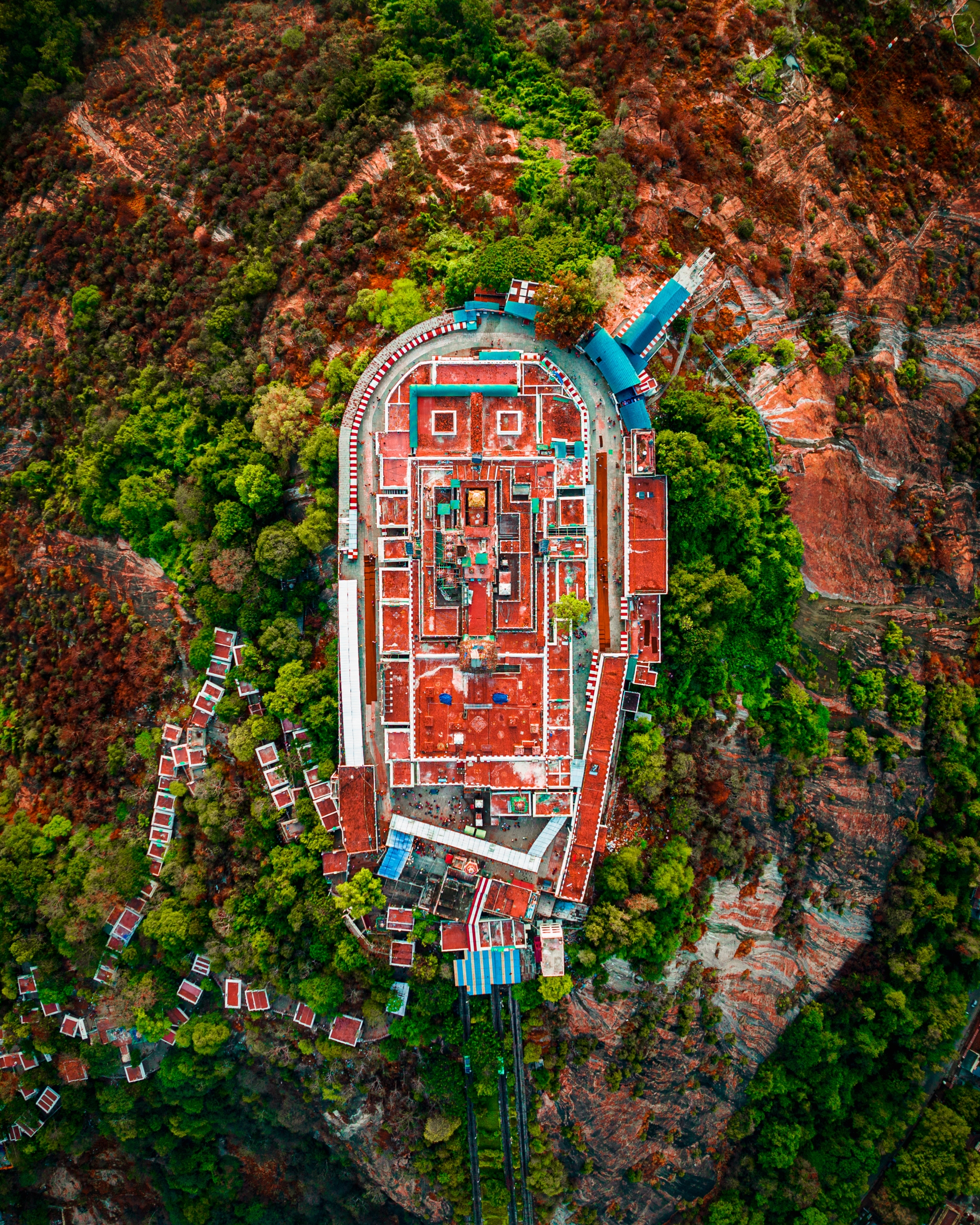 Palani Kovil top-view photos reveal a mesmerizing sight of the sacred temple nestled amidst the lush landscape. The intricate architecture, colorful rooftops, and surrounding greenery create a harmonious blend of spirituality and natural beauty. This aerial perspective captures the serene grandeur of Palani Kovil, an iconic pilgrimage destination in Tamil Nadu, India.