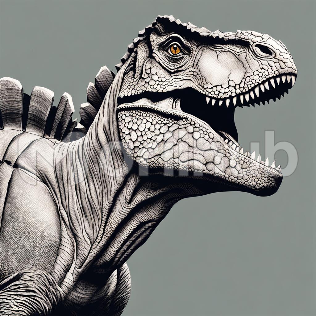 In a captivating painting, a dinosaur roars to life with vibrant hues. The prehistoric giant, rendered with meticulous detail, stands against an ancient landscape. The play of light and shadow accentuates its colossal presence, while the rich palette captures the majesty of this bygone era, breathing life into the canvas.