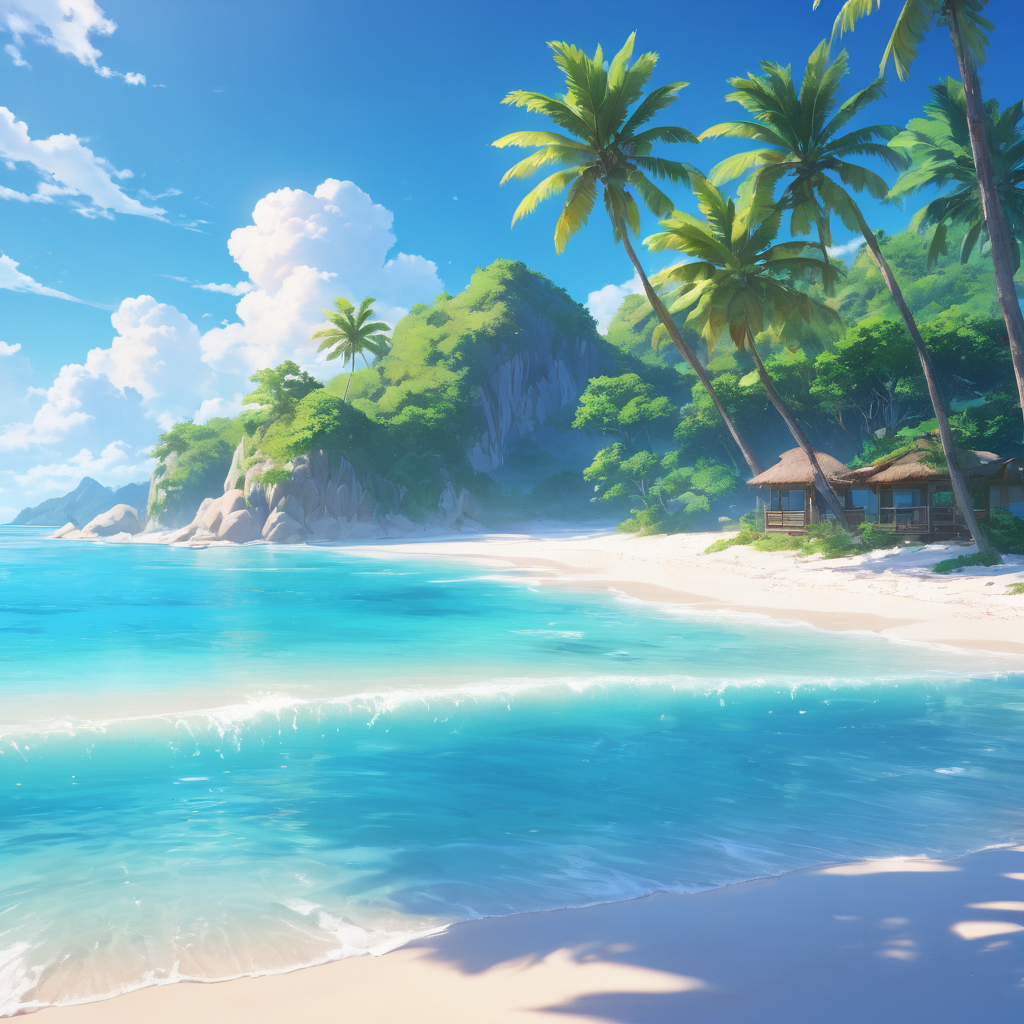 On a pristine white sand beach, palm trees sway gently in the tropical breeze. Crystal-clear waters lap against the shore, reflecting the azure sky above. The rhythmic sound of waves provides a soothing melody, as seagulls soar overhead. Sunlight dances on the surface, creating a dazzling spectacle. The tranquil ambiance invites relaxation and rejuvenation, offering a picturesque escape into nature’s embrace, where palm-fringed shores meet the endless expanse of the sea.