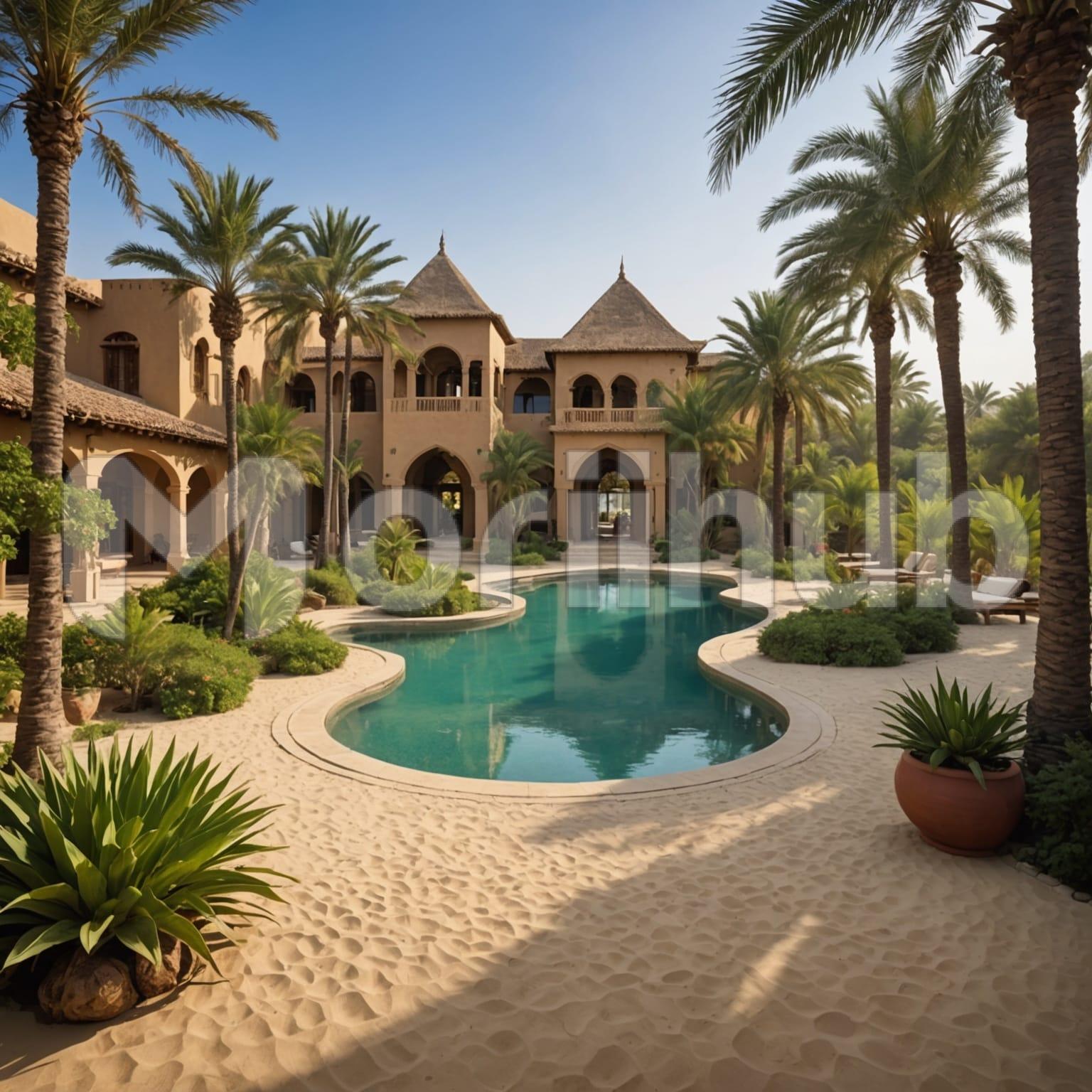The pool glistens under the clear sky, its inviting blue waters a perfect complement to the warm, sunny day. Surrounding the pool, tall palm trees sway gently, adding a tropical touch and offering patches of shade. Nearby, a building with a modern design overlooks the pool area, providing convenient access and a stylish backdrop. The entire scene exudes a sense of relaxation and leisure, ideal for a refreshing swim or lounging by the water, all under the serene, cloudless sky.