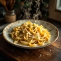 A plate of spaghetti is artfully arranged, showcasing long, twirling strands that glisten with a light sheen. The pasta is perfectly cooked, offering a delightful al dente texture that invites enjoyment. A rich, savory sauce clings to each strand, infused with herbs and spices, creating a mouthwatering aroma. Garnished with a sprinkle of freshly grated cheese, the dish is visually appealing. The plate, elegantly curved, adds to the presentation, inviting diners to savor every bite of this classic Italian delight, brimming with flavor and warmth.