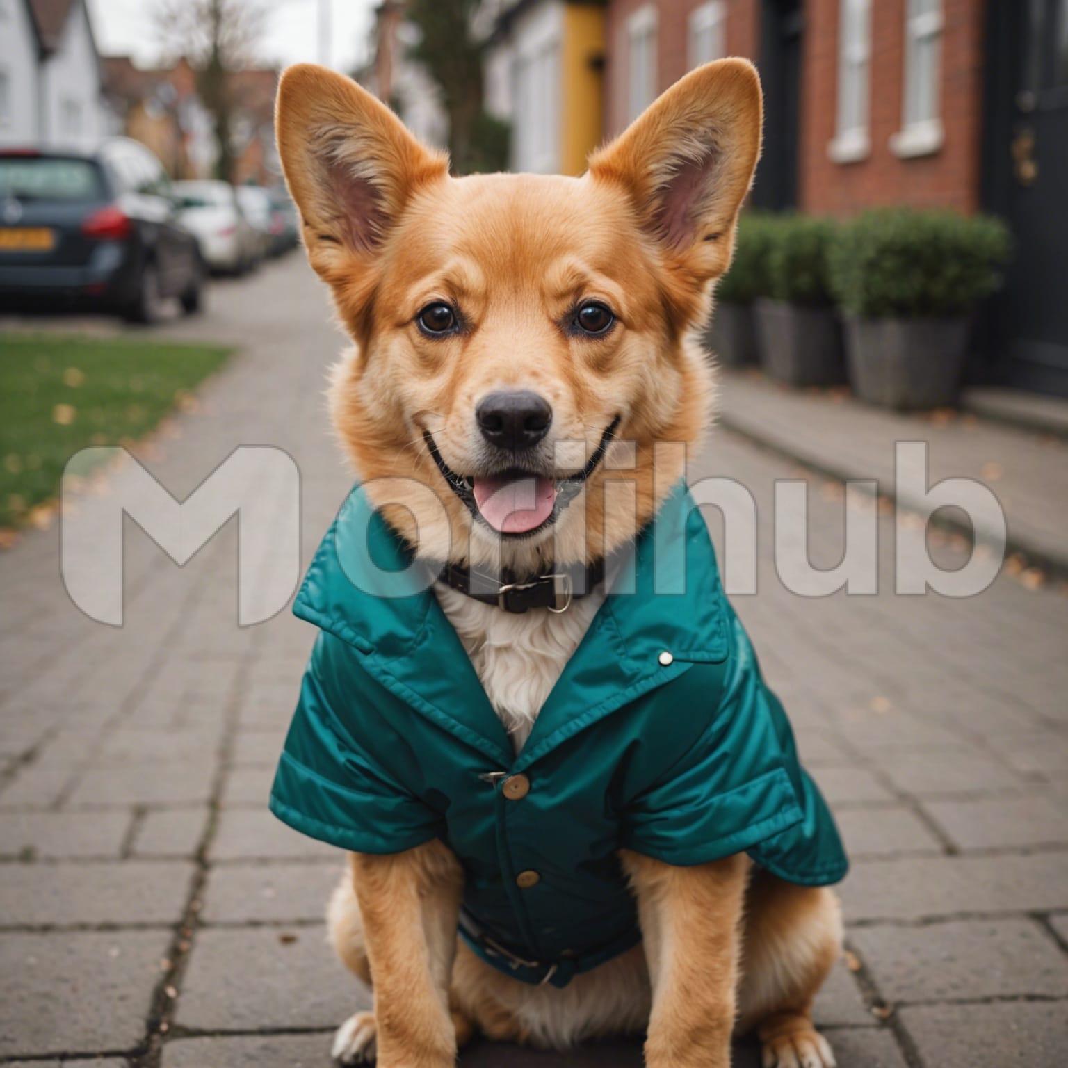 A dog sits proudly on the pavement, adorned in a snug coat that matches its sleek fur. With attentive eyes and perked ears, it surveys its surroundings, a picture of alertness and contentment. The coat, a vibrant contrast against the dull pavement, keeps the chill at bay, offering warmth and protection. In this simple scene, a canine companion brings warmth and charm to the city streets.