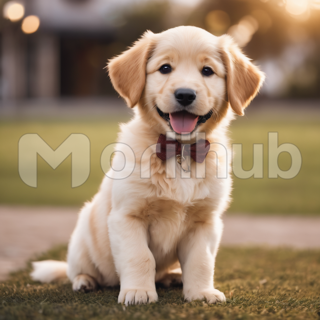 In the golden glow of sunlight, a cheerful pup sits proudly on the front lawn, his tail wagging in joy. With a charming bowtie adorning his neck, he exudes an air of dapper elegance. His eyes twinkle with mischief and affection as he gazes at the world with boundless enthusiasm. In this picturesque scene, his infectious smile brightens the day, bringing warmth and happiness to all who behold his playful presence.