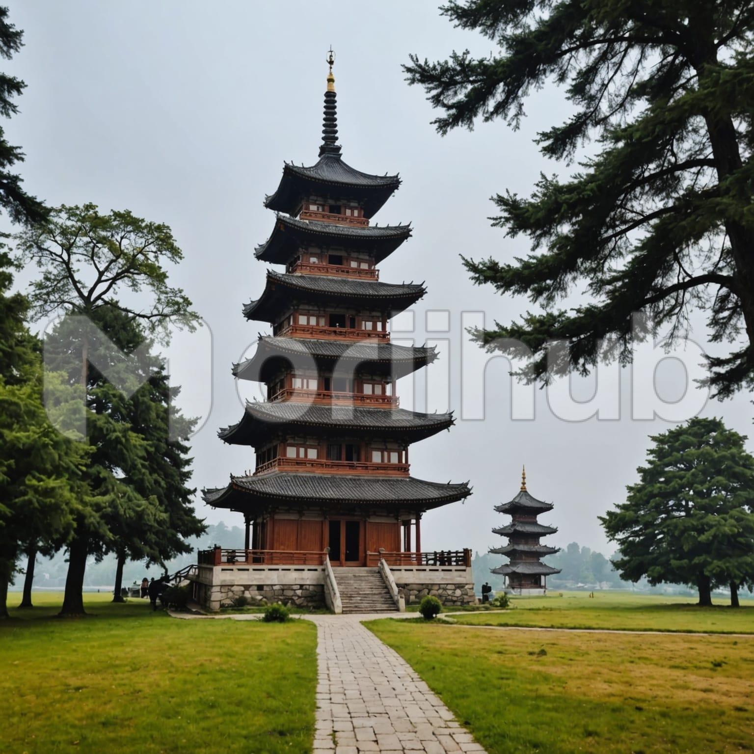 A beautiful pagoda stands tall in the center, its intricate architecture rising gracefully against the backdrop of a tranquil landscape. Surrounding the pagoda, trees line the edges of the field, their leaves gently swaying in the breeze, adding a touch of natural serenity to the scene. In the distance, another pagoda is visible, its silhouette faint but distinct, creating a sense of symmetry and depth. The scene feels peaceful and harmonious, with the pagodas serving as focal points in the quiet, expansive setting.