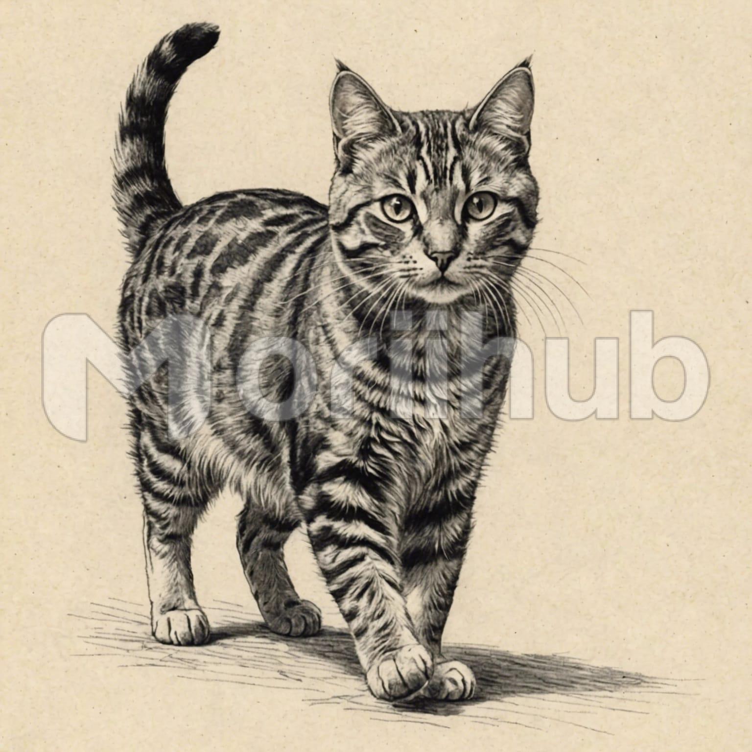 In a pencil sketch, a cat is captured mid-stride against a plain background. The artist’s precise lines depict the cat’s graceful movement, its tail held high and ears alert. The shading adds depth, highlighting the sleek fur and muscular build of the feline. The simplicity of the background directs attention to the cat’s natural elegance and poise. This minimalist composition invites admiration for the artist’s skill in capturing the essence of the cat’s motion and the quiet strength inherent in its every step.