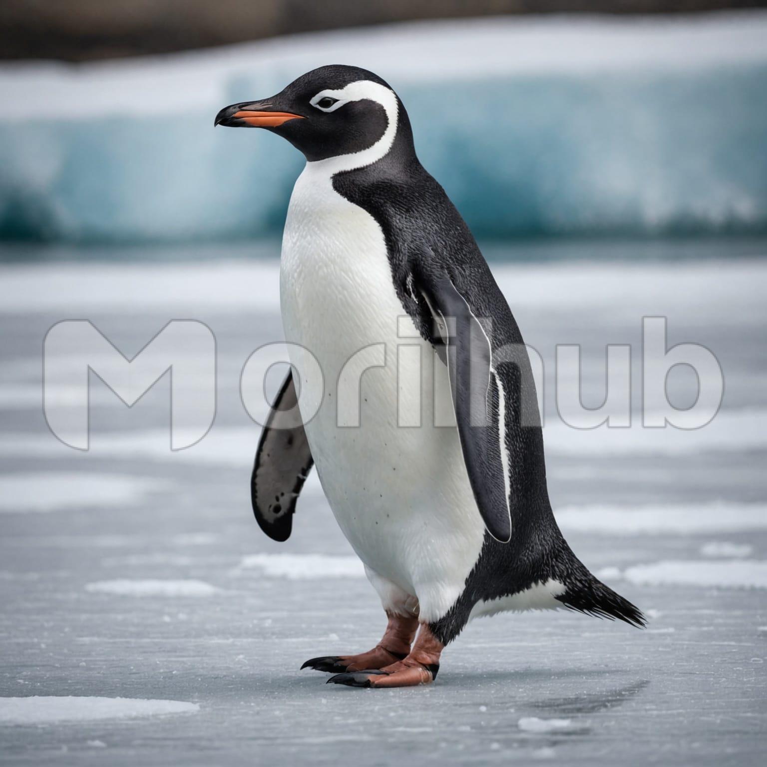 A lone penguin steps forward, its small form contrasting with the vast, open space around. Its flippers slightly spread for balance, creating a steady, determined waddle as it makes its way across a blank, pristine landscape. The penguin’s body leans slightly forward, emphasizing its forward momentum in this quiet, solitary journey. Shadows stretch gently around it, capturing the contours of its smooth, rounded body. With each step, the penguin moves purposefully, as if on a personal mission, evoking a sense of quiet resilience against the stark, undisturbed surroundings.