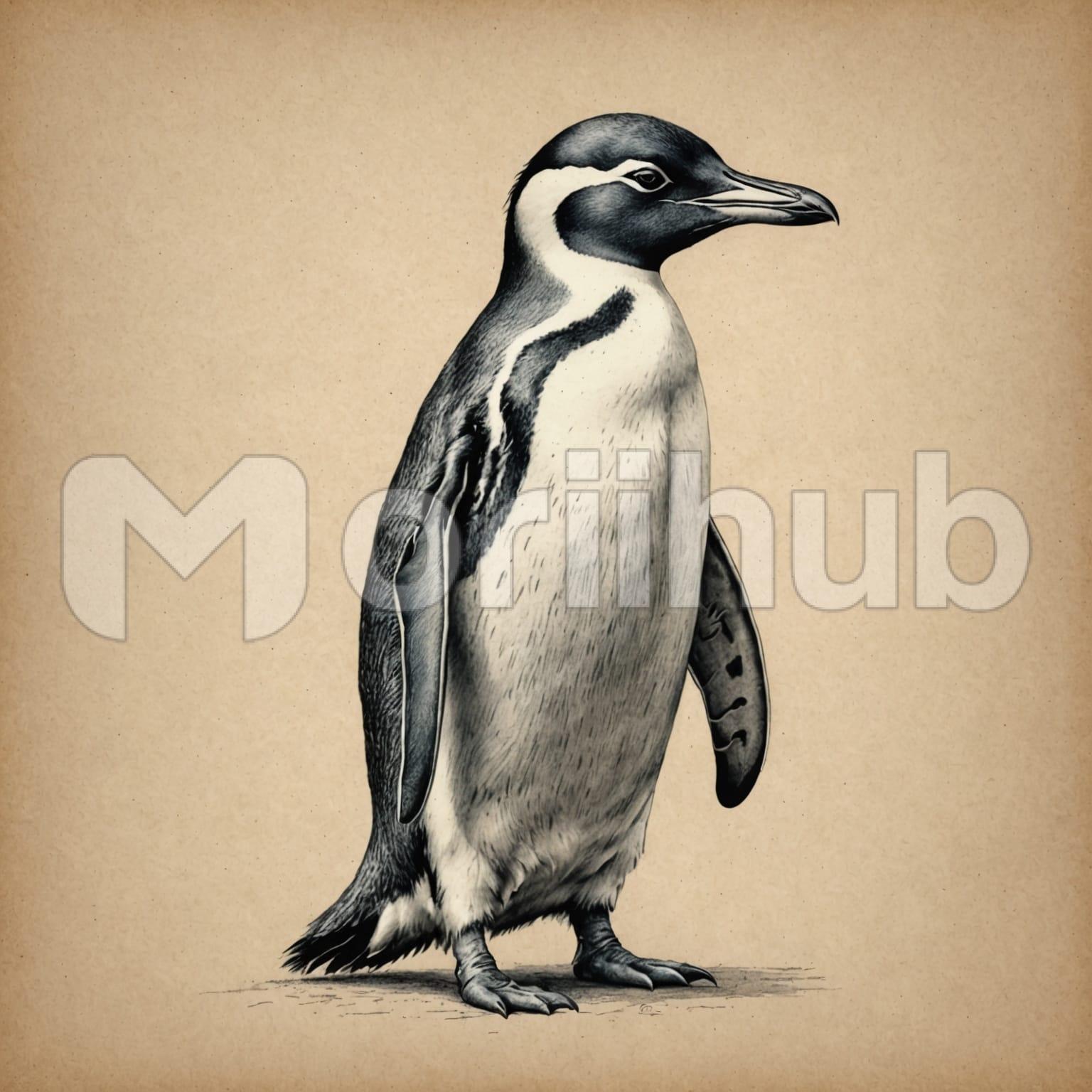 The drawing depicts a penguin in a charming and upright pose, showcasing its distinct features with precision. Its body is outlined in smooth, confident strokes, highlighting its sleek form. The characteristic contrast of its markings is captured thoughtfully, emphasizing the penguin’s natural elegance. The flippers rest naturally at its sides, while the feet are firmly planted. The gaze of the penguin is forward, exuding a sense of curiosity and awareness. The simplicity of the plain background enhances the focus on the penguin itself, creating a delightful visual.
