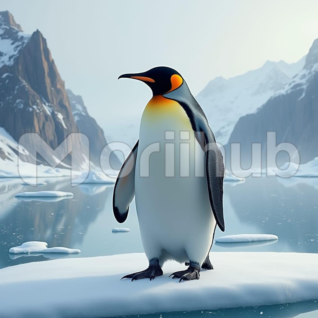A penguin steps forward on the ice, its small figure in contrast to the wide, frozen landscape. In the distance, a still lake mirrors the soft outlines of towering mountains beyond, adding a sense of depth to the scene. The penguin’s steady, purposeful walk across the icy surface adds a gentle motion to the tranquil setting. The snow-capped mountains stand tall, framing the scene with quiet majesty. Together, the elements evoke a sense of pristine beauty, with the penguin navigating its natural, serene world.