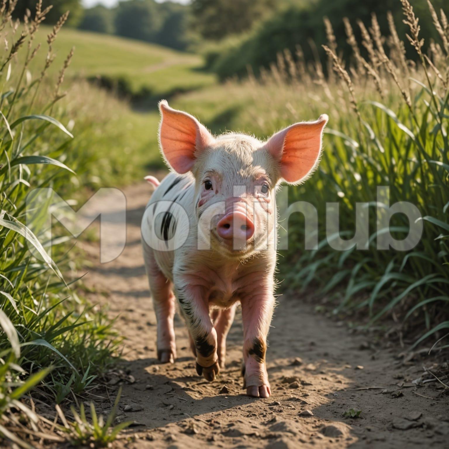 A pig walks along a grassy path, its hooves pressing softly into the earth. The path stretches through a lush green landscape, with tall grass swaying gently on either side. The pig moves with a steady, unhurried pace, its large body shifting as it walks. Its small tail wags contentedly as it continues its way. The scene is quiet, filled with the subtle sounds of nature, as the pig explores its surroundings. The moment feels peaceful and simple, capturing the calm of rural life.