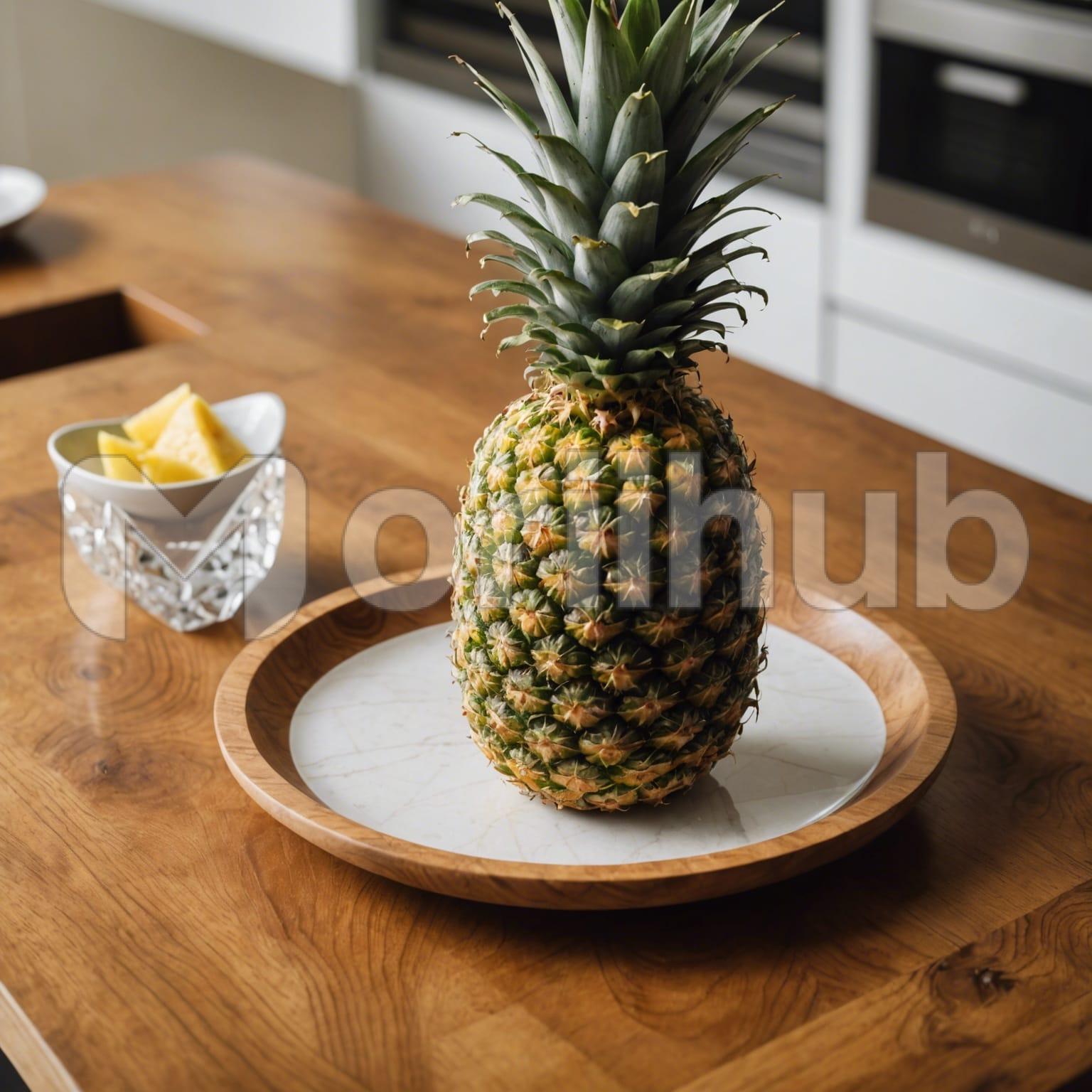 A vibrant pineapple rests upon a pristine plate on the counter, adorning the space with its tropical allure. Its golden skin, textured with intricate patterns, hints at the succulent sweetness within. The fruit exudes a tantalizing aroma, filling the air with hints of freshness and zest. It stands as a symbol of exotic delight, ready to bring a burst of flavor and joy to those who savor its juicy flesh.
