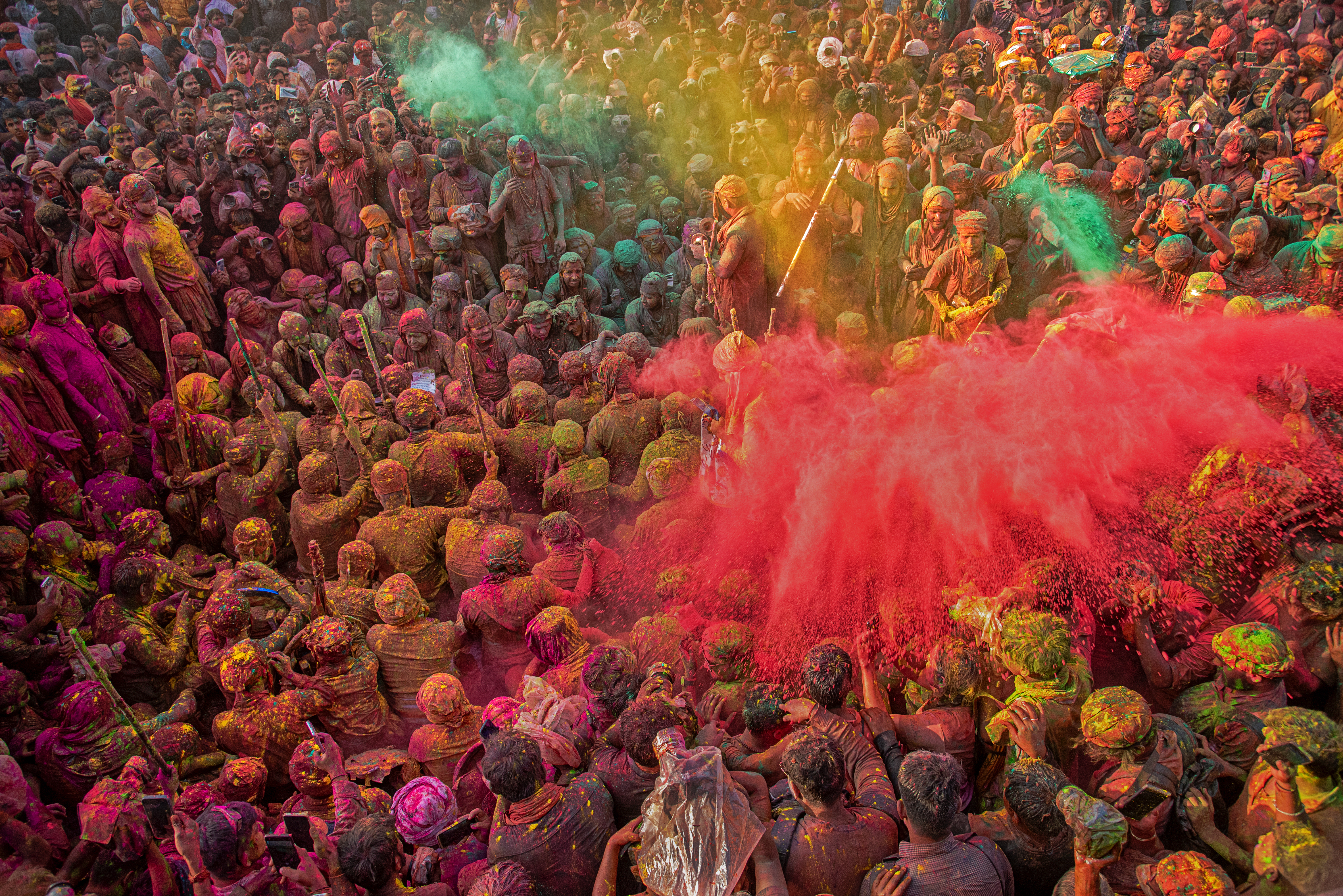 Holi is a popular Indian spring festival full of colors and joy. Celebration of HOLI at Nandagaon in Vrindavan.