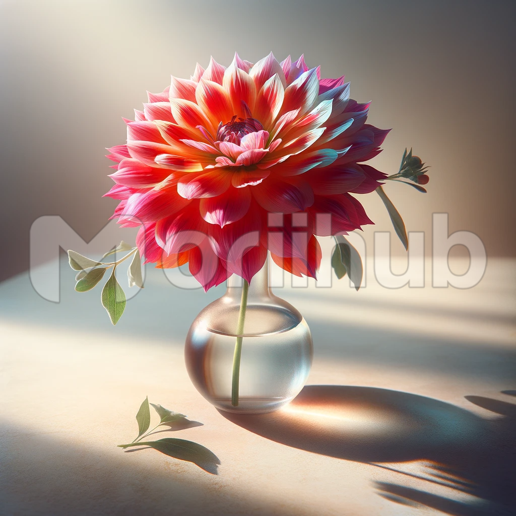 A stunning, large bloom commands attention as it graces a glass vase, resting delicately on a light-colored, smooth surface. Its petals burst forth in an array of captivating pink shades, radiating vibrancy and life. The play of light and color creates a mesmerizing spectacle, infusing the room with a sense of joy and natural beauty.
