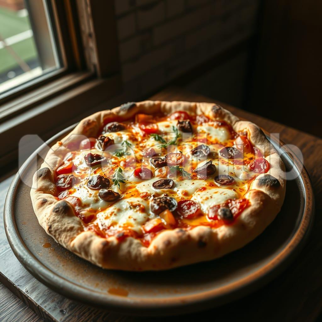 A full pizza rests on a plate, uncut, its round form complete and inviting. The crust is slightly raised at the edges, with a gentle crispness, while the center remains smooth and flat. Generous toppings cover the surface—thinly layered cheese, and a subtle glisten from the sauce beneath. The dough appears evenly baked, with no section overdone or soft. It’s positioned neatly on the plate, nothing hanging off. The background is plain, drawing attention to the pizza’s symmetry, warmth, and the anticipation it quietly suggests.