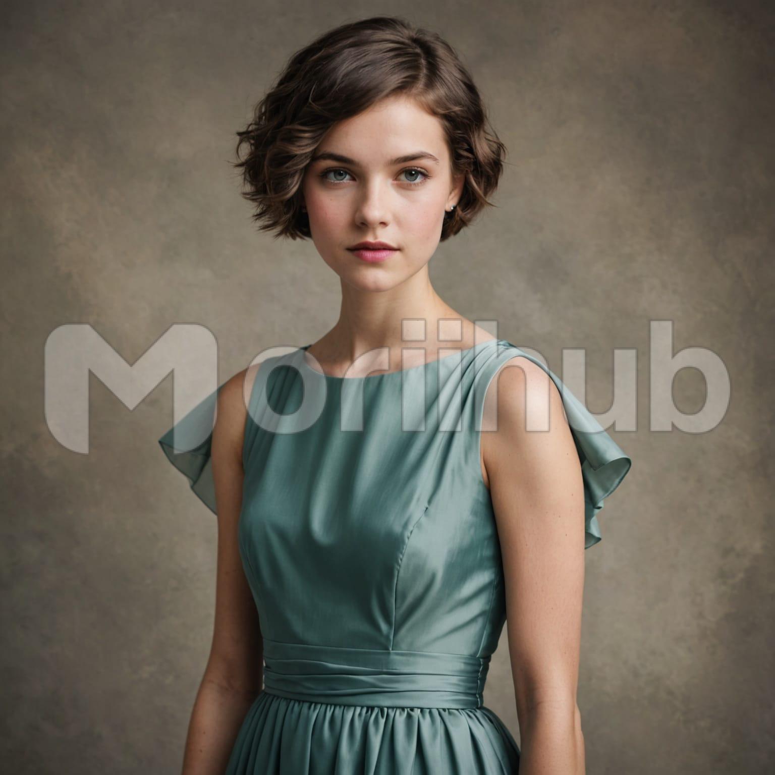 A beautiful woman is portrayed with elegance, looking ahead with a calm, steady presence. She dons a flowing gown, its design carrying a refined simplicity that highlights her natural grace. Against a plain background, her figure stands out with quiet strength and poise, every line of her stance reflecting composure. The gown’s form drapes in a way that adds to her dignified bearing, free from excess yet striking in effect. The scene is uncluttered, allowing her presence to command attention without distraction.