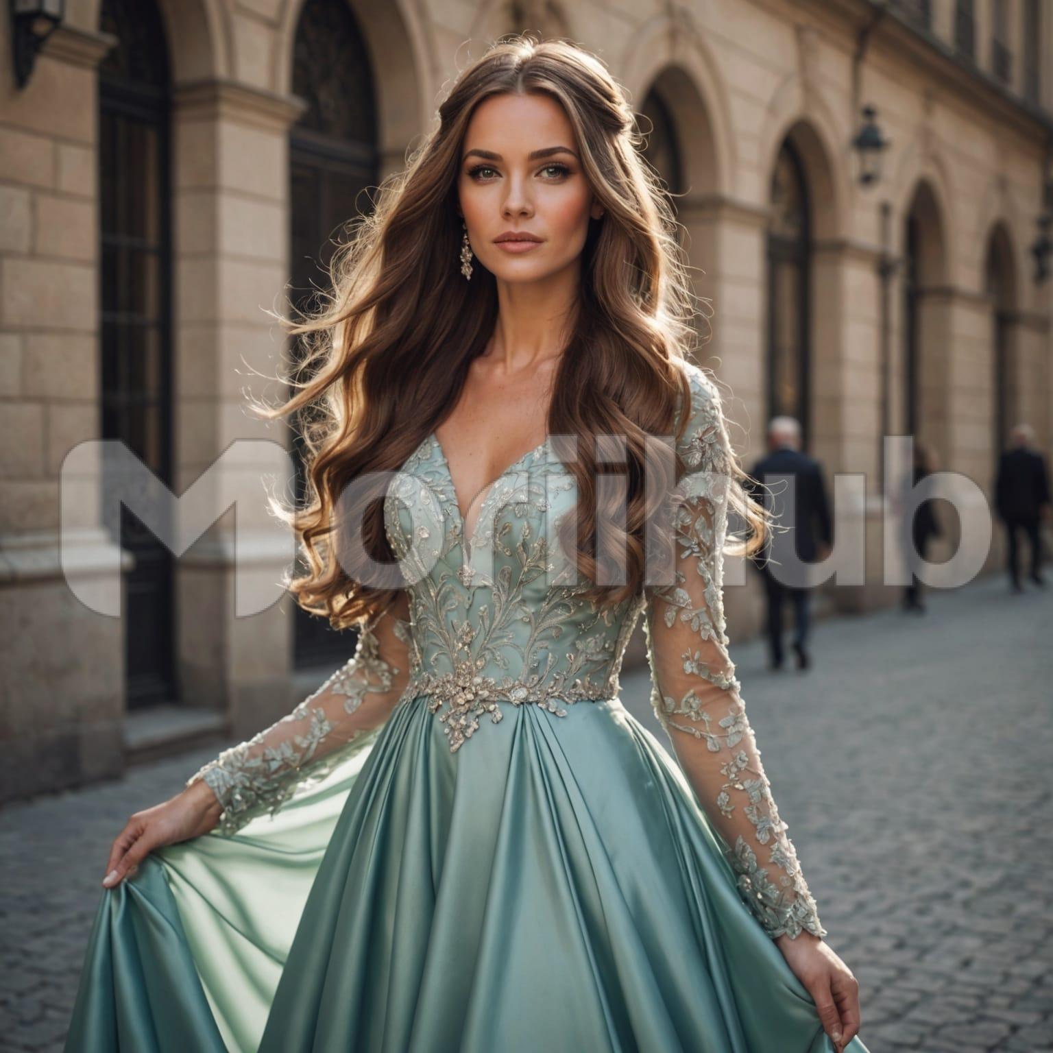 A beautiful woman gazes into the distance, her presence captivating in a flowing gown that drapes elegantly around her figure. The fabric shimmers softly, reflecting light and accentuating her graceful silhouette. Her hair cascades down her shoulders, framing her face and adding to her allure. With a serene expression, she embodies a sense of confidence and poise, as if she is lost in thought yet fully aware of her surroundings. The gown sways gently with her movements, enhancing the enchanting aura she exudes, inviting admiration from all who behold her.