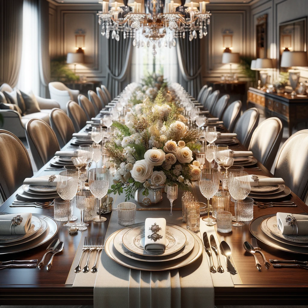 An exquisite dining tableau unfolds, featuring a polished walnut table set for a formal dinner. The lustrous wood gleams under the soft glow of crystal chandeliers. Fine china, glistening silverware, and crystal glasses adorn the table, perfectly aligned. A centerpiece of fresh flowers and ornate candleholders adds a touch of natural beauty and elegance. This sophisticated arrangement of tableware and decorations creates a captivating atmosphere of refinement and grace, promising a memorable dining experience.