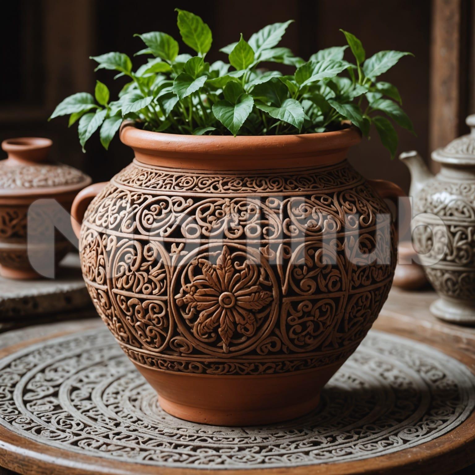 A clay pot rests calmly, its rounded surface detailed with intricate designs carved with care. The patterns form repeating motifs, wrapping around the pot’s body and adding texture. Its earthy tones give it a natural feel, smooth yet tactile. Inside, a plant grows, its leaves stretching outward in gentle arcs. The green contrasts softly with the pot’s warm color. Together, they create a quiet balance between crafted art and living growth. The scene feels simple and intentional, showcasing both the pot’s fine detail and the plant’s delicate presence.