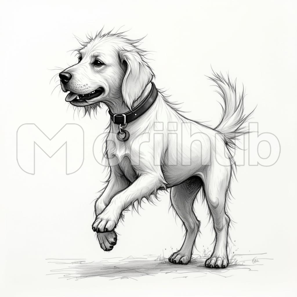 A drawing of a dog captures it in mid-stride, its body angled forward with energy and movement. Smooth lines define the stretch of its legs and the curve of its form. Light shading adds depth, highlighting the texture of its fur and the strength of its build. Its ears are drooped, following the motion, while its gaze remains focused ahead. The tail extends behind, complementing the sense of speed. With a minimal background, the sketch keeps attention on the dog, emphasizing fluidity and motion in its dynamic pose.