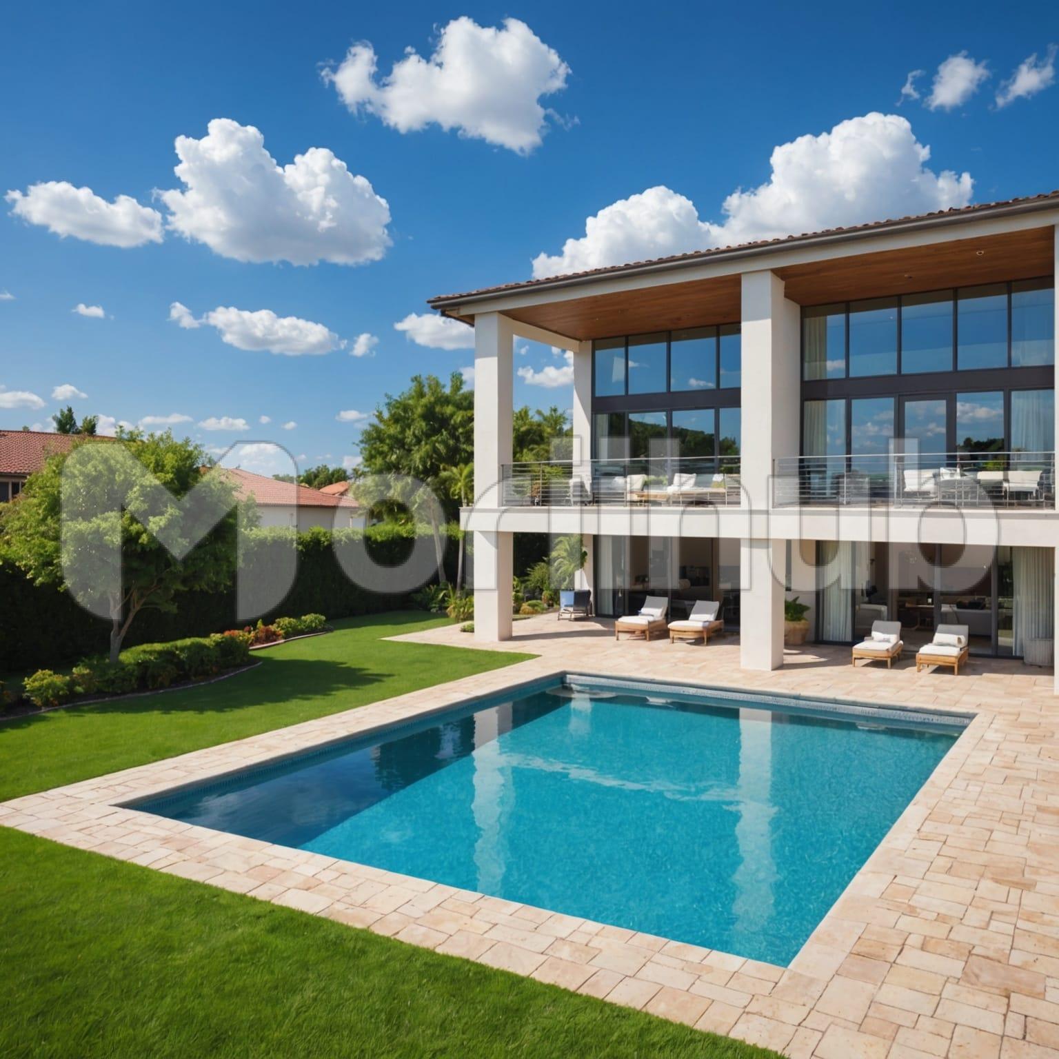 In front of the house, a pristine pool glistened under the clear blue sky. Its surface mirrored the tranquil hues above, reflecting the occasional wisps of clouds drifting lazily by. Surrounding the pool, neatly trimmed greenery framed the scene, adding a touch of natural elegance to the pristine setting. The water’s azure depths invited a refreshing dip, while sunlight danced playfully on its ripples. The peaceful ambiance, accentuated by the gentle breeze, created a perfect oasis of serenity, where the harmony of sky, water, and landscape blended into a serene symphony of relaxation.
