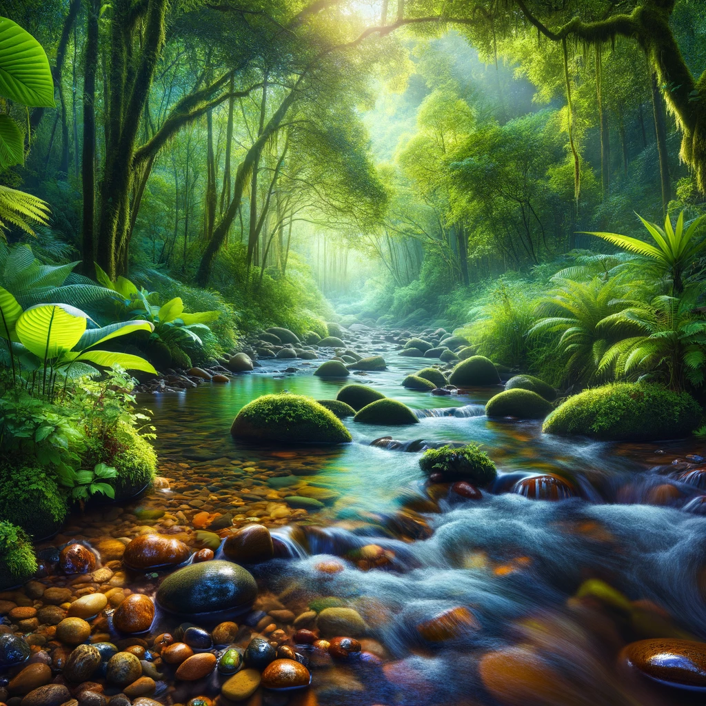 Imagine a pristine stream winding its way through a verdant landscape, its crystal-clear waters cascading gently over smooth stones and pebbles. Each stone, adorned with moss and lichen, adds to the stream’s enchanting allure, creating a harmonious symphony of nature’s beauty. The lush greenery that surrounds the stream paints a picture of tranquility and serenity, inviting one to pause and immerse themselves in the peaceful embrace of the natural world.