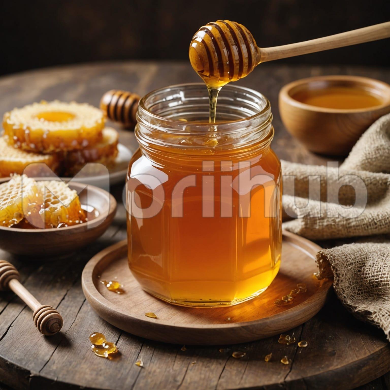 A jar of honey rests open on the table, its clear glass showing the thick, golden contents inside. The surface of the honey appears smooth, with a slight unevenness where it was last touched. Light reflects gently along the jar’s edges, highlighting the rich texture within. No movement disturbs the scene. The honey remains still, natural and simple, offering a quiet presence in the open space, calm and unbroken in its quiet display on the table.