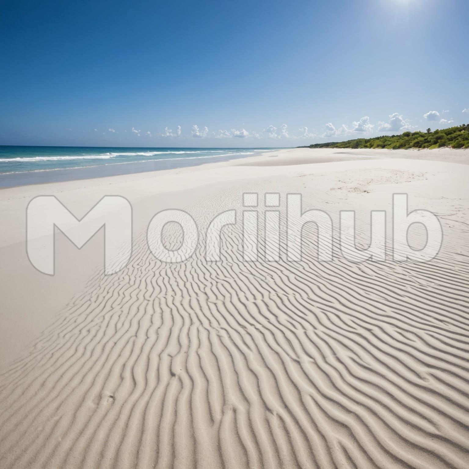 The white sand beach stretches with a smooth, undisturbed surface, meeting the ocean’s gentle waves. The shoreline curves subtly, where the water’s edge shimmers under soft light. Sparse clouds drift across the sky, adding depth without obscuring the openness above. The ocean, visible in the corner, extends toward the horizon, its surface shifting with quiet movement. The scene remains calm, where the contrast between sand, sky, and water creates a balanced composition. A peaceful expanse, untouched and serene, invites quiet appreciation of its simplicity.