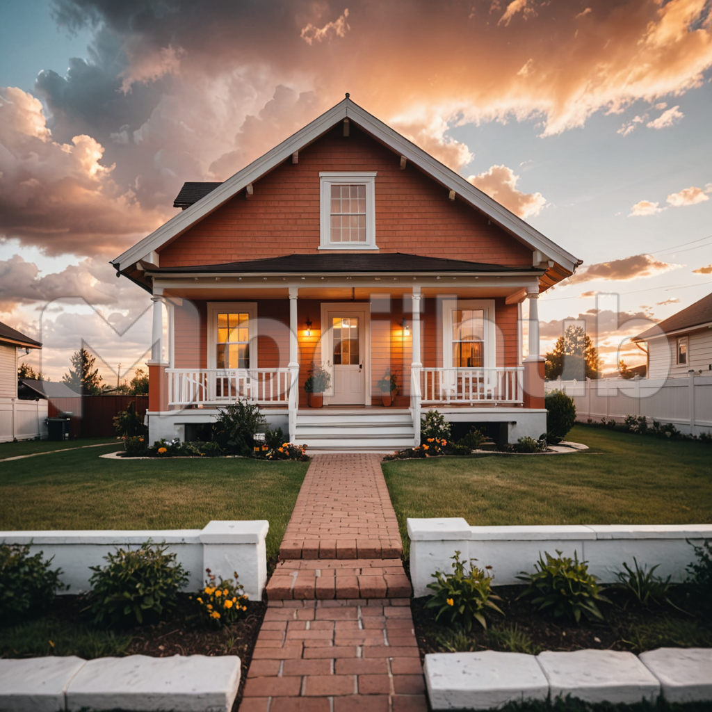 Amidst the quiet neighborhood stands a charming house, its warm glow inviting under the evening sky. Lights illuminate the front porch, casting a welcoming aura. A pristine white wooden fence encloses the property, adding to its quaint appeal. Shadows dance across the manicured lawn, hinting at the tranquility within. It’s a scene of suburban serenity, where the comforting glow of home beckons, promising warmth and security amidst the twilight.