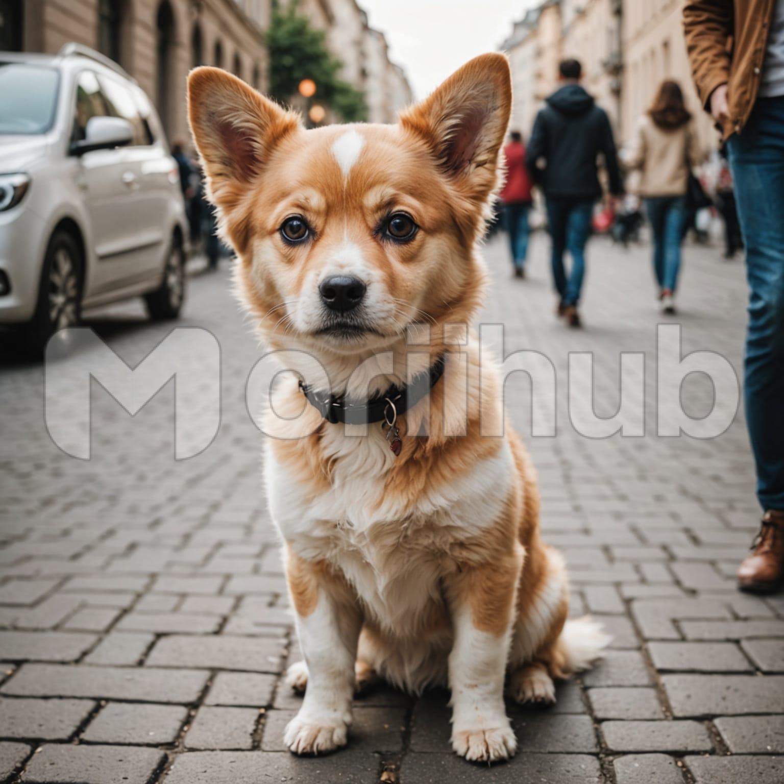 A cute dog sits calmly on the road, its small frame steady and relaxed. Rounded ears point upward, and its eyes stay focused ahead with a gentle, quiet look. Behind the dog, people can be seen walking along, their movements distant and steady, adding light activity to the scene. The road stretches open, with nothing nearby to crowd the space. The dog remains still, quietly observing without rush, while the people pass by in the background. The simple scene feels peaceful, centered around the quiet, watchful presence of the seated dog.