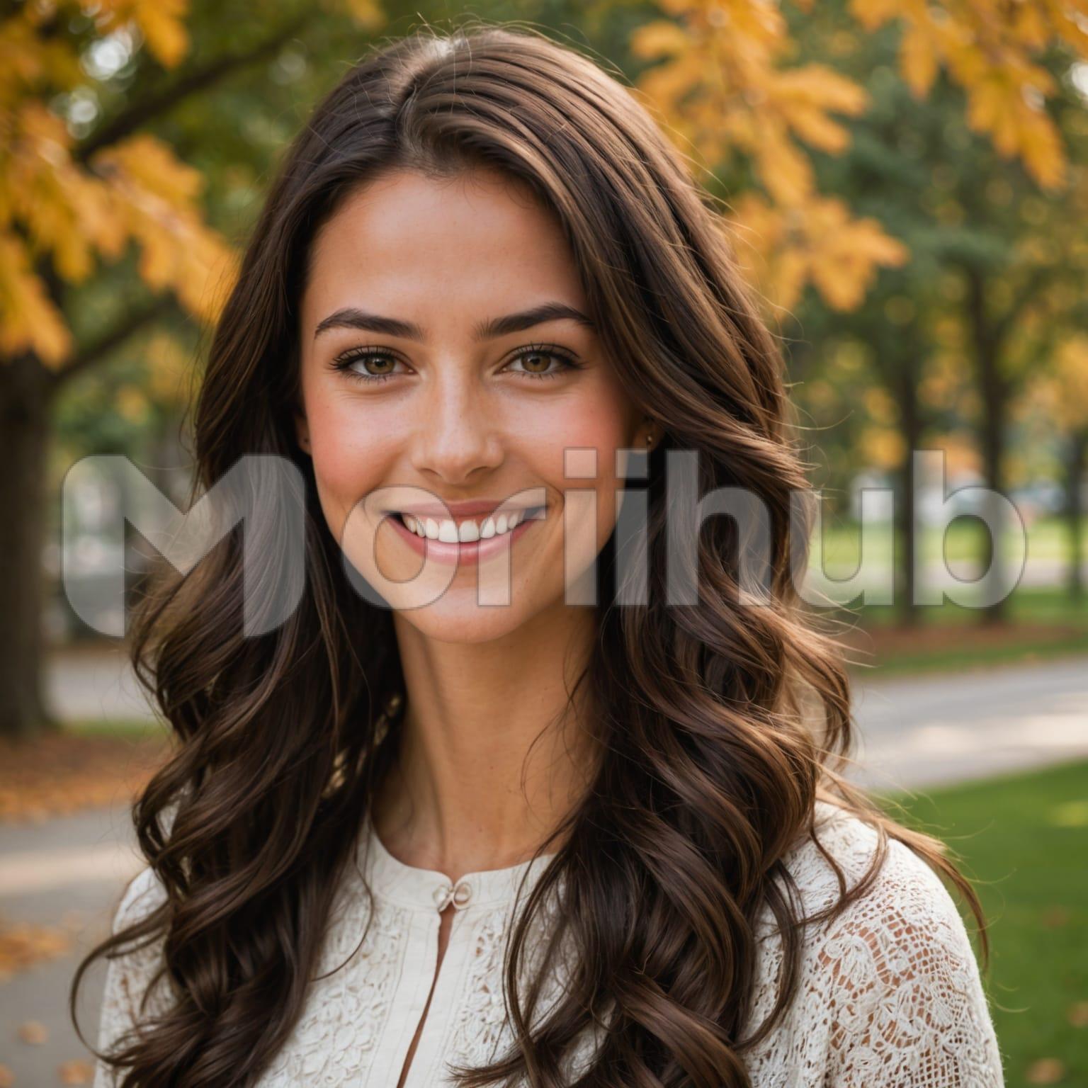 A woman stands, gazing into the distance with a quiet calm. Her features are delicate, framed by hair that falls just above her shoulders. Her expression is serene, and a soft smile plays at the corners of her lips, as if caught in a pleasant thought. There’s a quiet confidence in her posture, an ease that draws the eye without effort. The way she carries herself seems timeless, and her gaze reflects a depth of understanding, as though she’s seeing something beyond what’s before her.