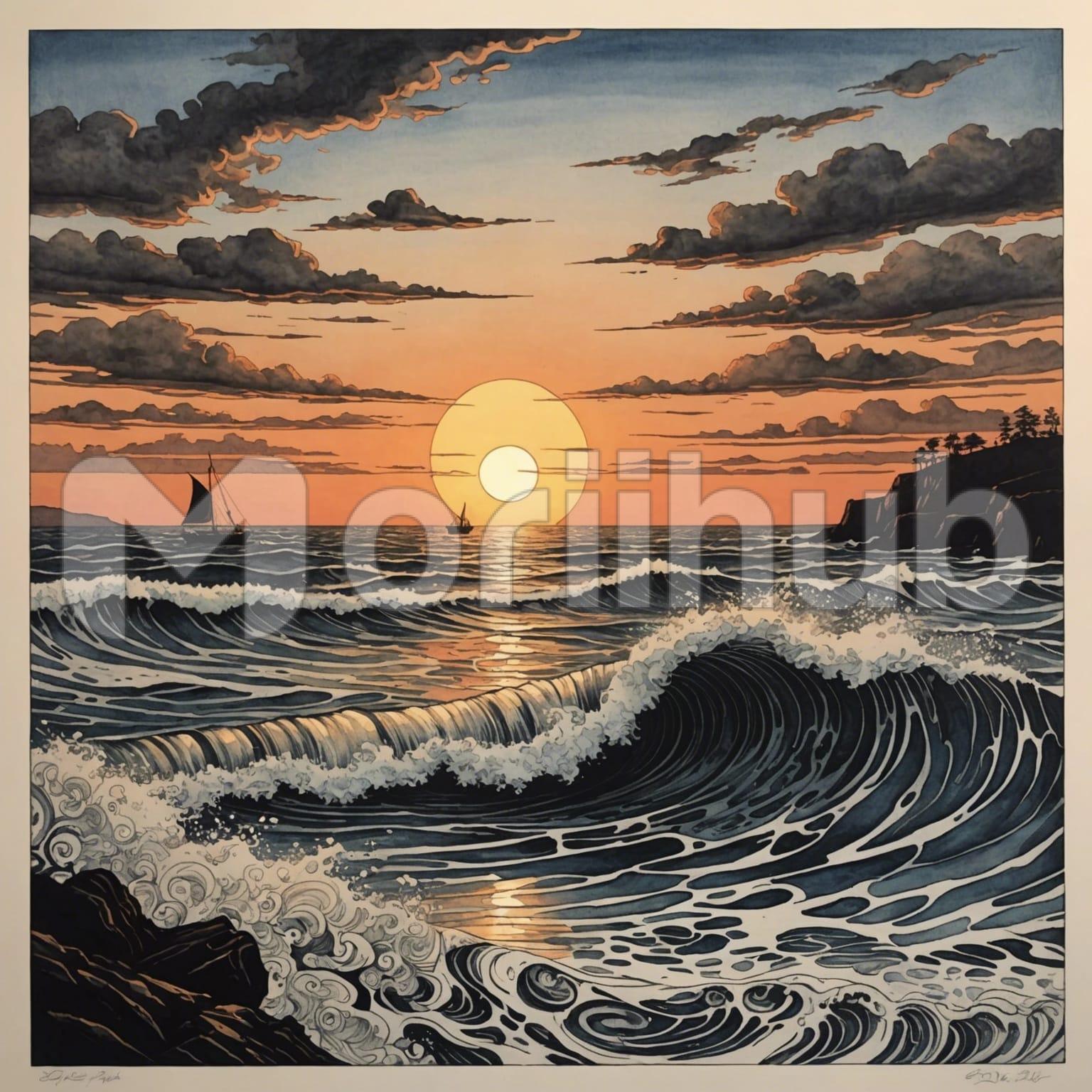 The artwork captures a mesmerizing sunset over the sea, where the sky is ablaze with  vibrant hues. The sun hovers just above the horizon, casting a shimmering path of light across the gentle waves. In the distance, a few boats are silhouetted against the radiant backdrop, their shapes adding a sense of depth and tranquility. The sea reflects the vibrant colors of the sky, creating a harmonious blend of light and water. The overall scene evokes a serene and peaceful atmosphere, encapsulating the beauty of nature’s daily spectacle.