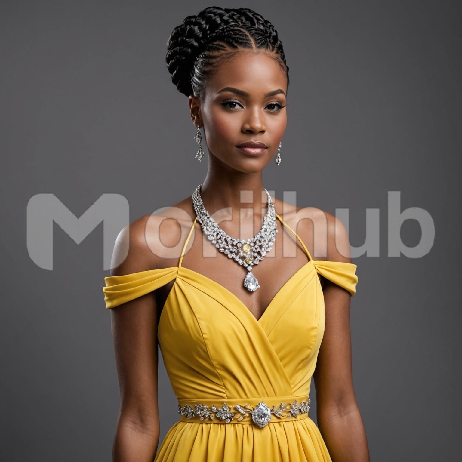 A beautiful woman looks on, her gaze composed. Her hair is braided and styled up with precision, creating a clean, elegant shape. A diamond neckpiece rests along her collar, its facets catching the light in quiet brilliance. Matching earrings complete the ensemble, adding a subtle glint near her face. The plain background offers no distraction, keeping the focus on her presence. There’s a balance in how everything is arranged—nothing overstated. Her appearance is refined, her posture still, and each element contributes to a quiet yet undeniable sense of elegance.