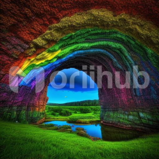 A vibrant rainbow arches gracefully across a natural landscape, stretching over lush green hills or a calm river. The colors of the rainbow contrast beautifully with the serene surroundings, creating a magical and uplifting scene. The clear sky and gentle sunlight enhance the vivid hues, making the moment feel peaceful and awe-inspiring.