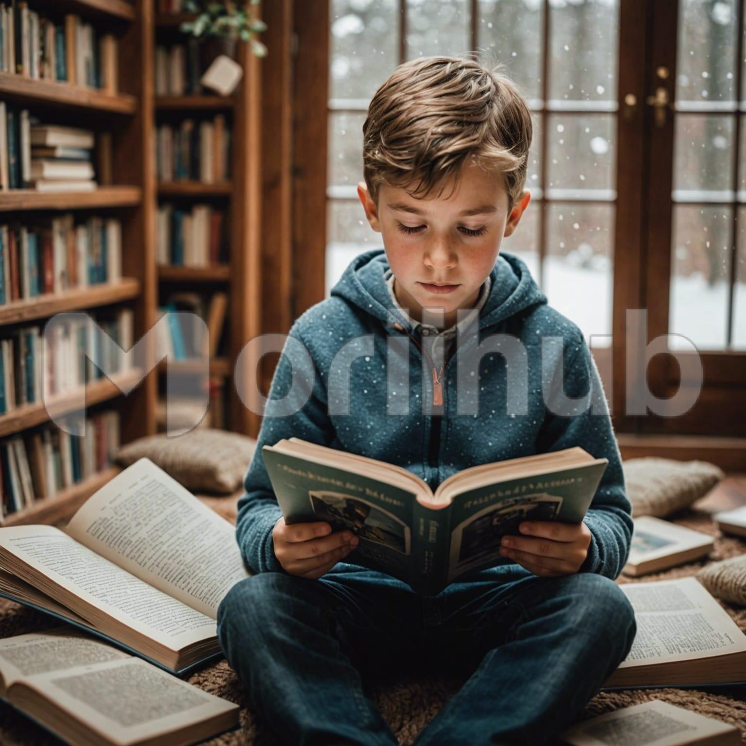 Amidst a sanctuary of stories, a boy engrossed in a book sits amidst a circle of opened tomes. His eyes, alight with curiosity, dance across the pages, absorbing each word with eager fascination. Around him, books lay sprawled, their worlds unfurling like petals in bloom, each offering a portal to adventure. In the corner, a bookshelf stands tall, its shelves cradling countless more tales waiting to be discovered. In this haven of literature, the boy finds solace, his imagination ignited by the endless possibilities that each page holds.