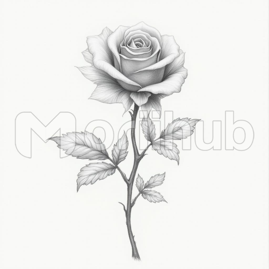 The sketch portrays a rose with fine lines, each petal unfolding in soft, natural curves. Shading adds depth, giving the bloom a sense of dimension. The leaves extend from the stalk, their edges defined with careful strokes, veins subtly traced to capture their texture. The slender stalk supports the flower, slightly curved, connecting each element in a balanced composition. Light and dark contrasts bring the drawing to life, emphasizing the intricate details. The simplicity of the monochrome lines highlights the elegance of the rose and its delicate form.