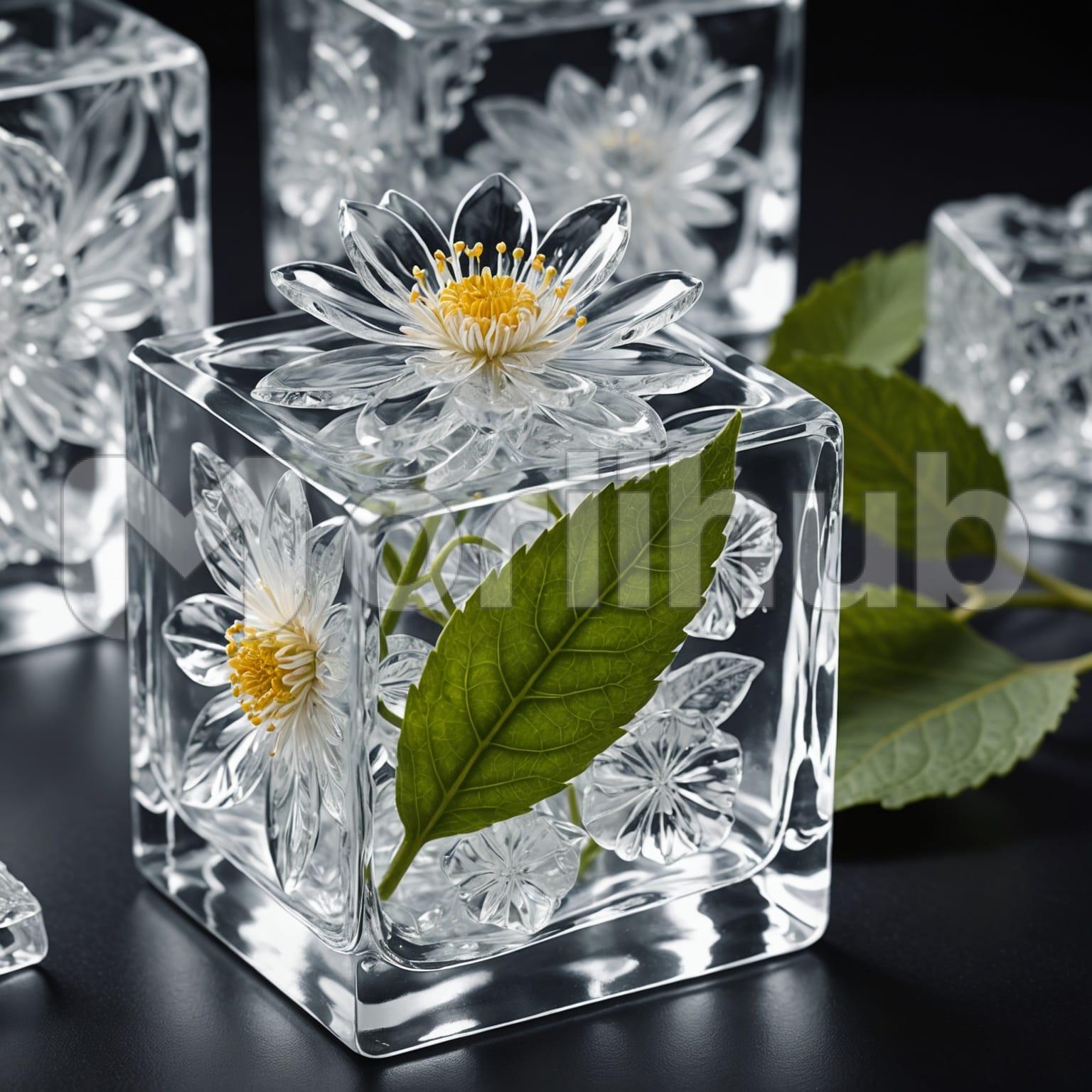 Several glass cubes are displayed, each featuring a unique floral print etched into their smooth surfaces. The flowers are finely detailed, with delicate petals and thin stems, creating a soft, intricate pattern. The cubes are clear, allowing light to pass through and reflect off the etched designs, which appear to float against the transparent background. The subtle contrast between the glass and the floral print creates an elegant, calm display. The cubes are arranged in a way that showcases each individual design while maintaining an overall sense of balance.
