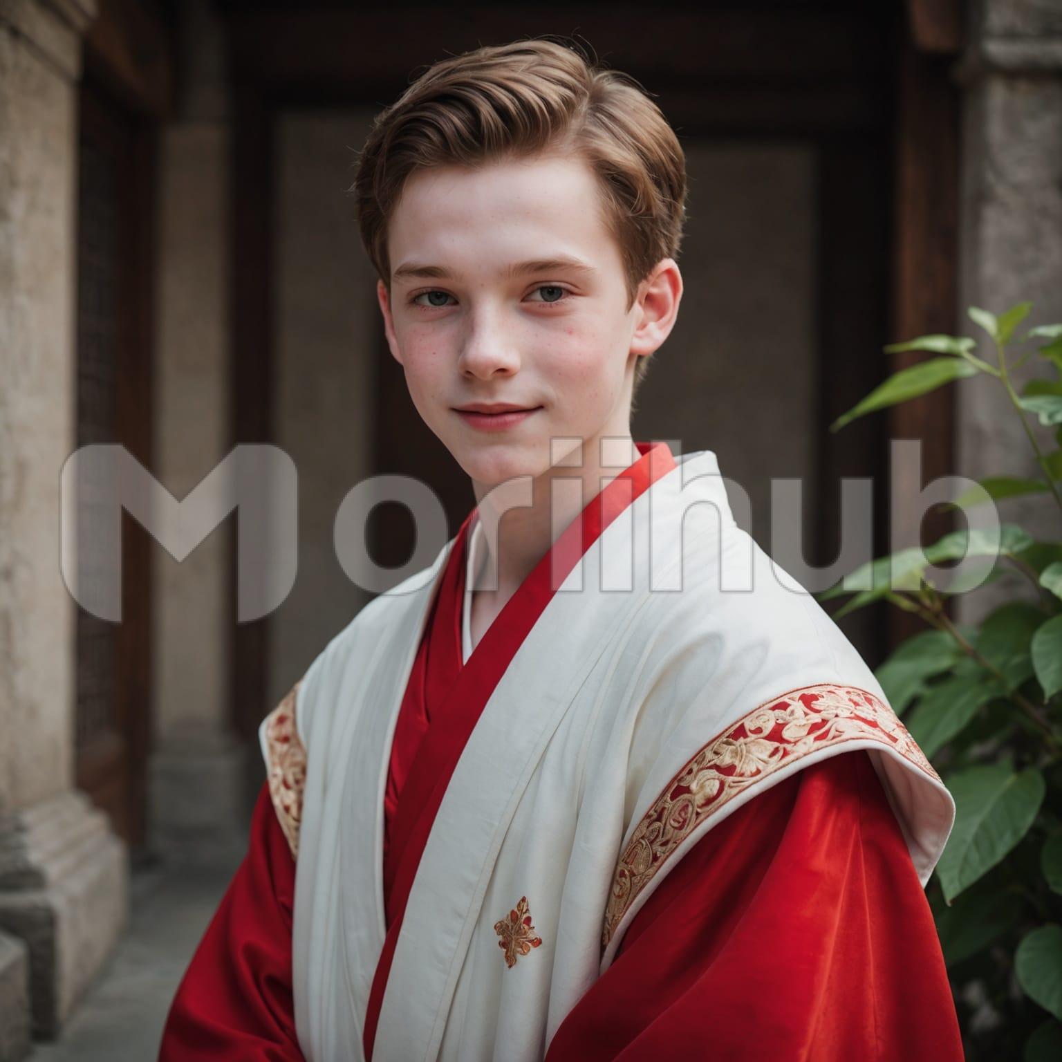 A teenage boy stands confidently, dressed in a striking red and white robe that drapes gracefully around him. The robe’s vibrant colors contrast boldly, with intricate patterns and folds that speak of cultural significance and tradition. His posture exudes a mix of youthful vigor and poised maturity, while his expression reflects a quiet determination. The fabric flows elegantly, accentuating his stature and adding a sense of regal presence to his demeanor. This attire embodies a blend of cultural pride and personal style, capturing a moment of individuality and cultural heritage.