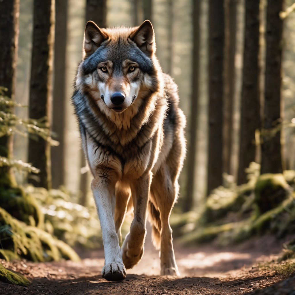 Bathed in the amber glow of a sunlit forest, a majestic wolf strides through the dappled shadows with regal grace. Sunlight peers through the dense foliage, casting a warm radiance upon its luxurious, russet fur. Each step resonates with the quiet strength of a wilderness monarch, while golden rays play upon its proud silhouette. Nature’s symphony hums in harmony as the wolf navigates the enchanting realm, a sovereign orchestrating a mesmerizing dance with light and shadow.
