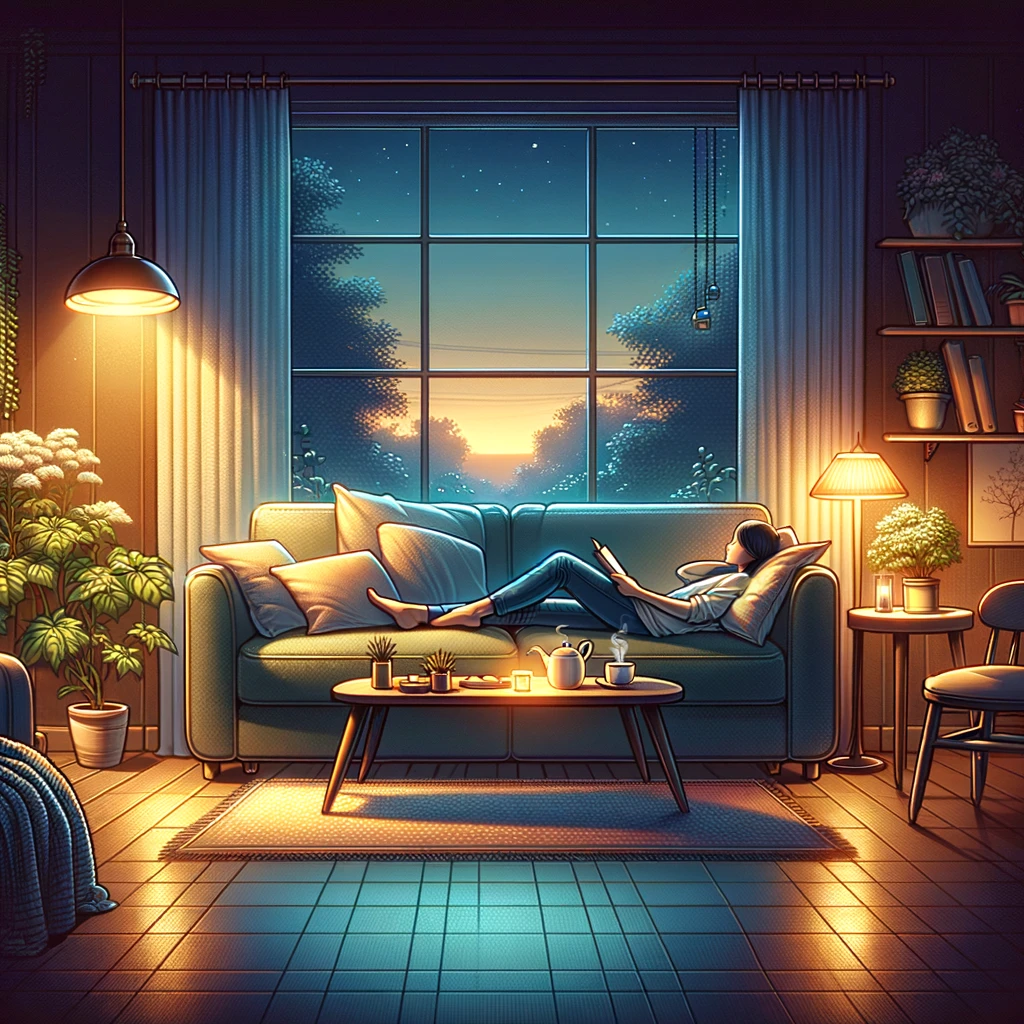 In the tranquil embrace of dusk, a cozy living room invites serenity and peace. Soft ambient light gently bathes the space, casting a warm glow that soothes the soul. The air is filled with a sense of calm as comfortable cushions and throws beckon you to unwind. Here, amidst quietude, one finds solace and rejuvenation.
