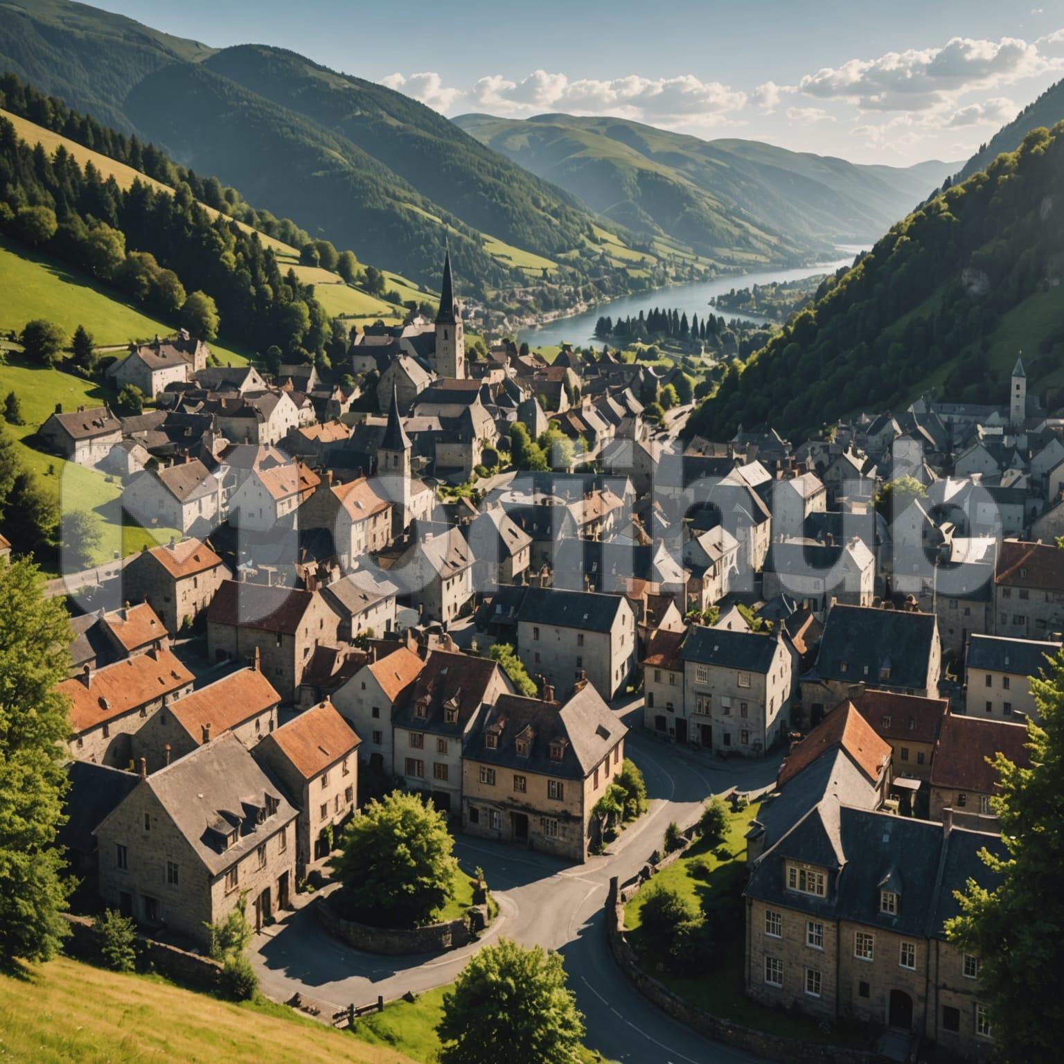 The town rests in a peaceful setting, its buildings varying in size and design, each with a distinct charm. Wisps of clouds drift across the sky, their delicate forms adding softness above. Greenery surrounds the area, with trees and foliage enhancing the town’s inviting atmosphere. The streets wind gently, lined with well-kept structures that blend seamlessly into the landscape. In the distance, rooftops and facades create a harmonious scene, framed by the natural elements that envelop the town in a quiet, picturesque embrace.