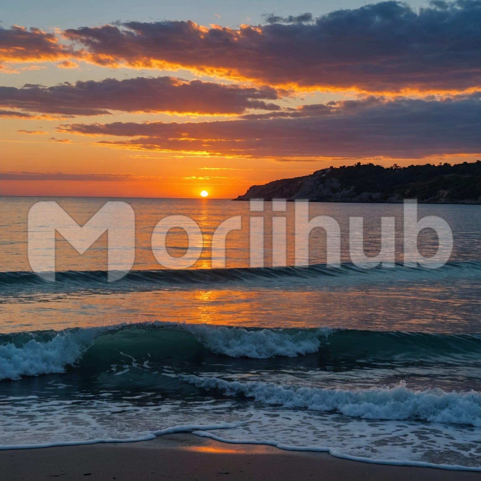The sun dips low on the horizon, casting a soft glow across the vast, shimmering sea. The waves gently ripple, reflecting the light from the sky. The air is calm, with a slight breeze carrying the scent of saltwater. The silhouette of distant boats is barely visible against the shimmering water. The sky is a perfect blend of fading light, with wisps of clouds adding depth to the tranquil scene. The peaceful beauty of the moment invites quiet reflection.