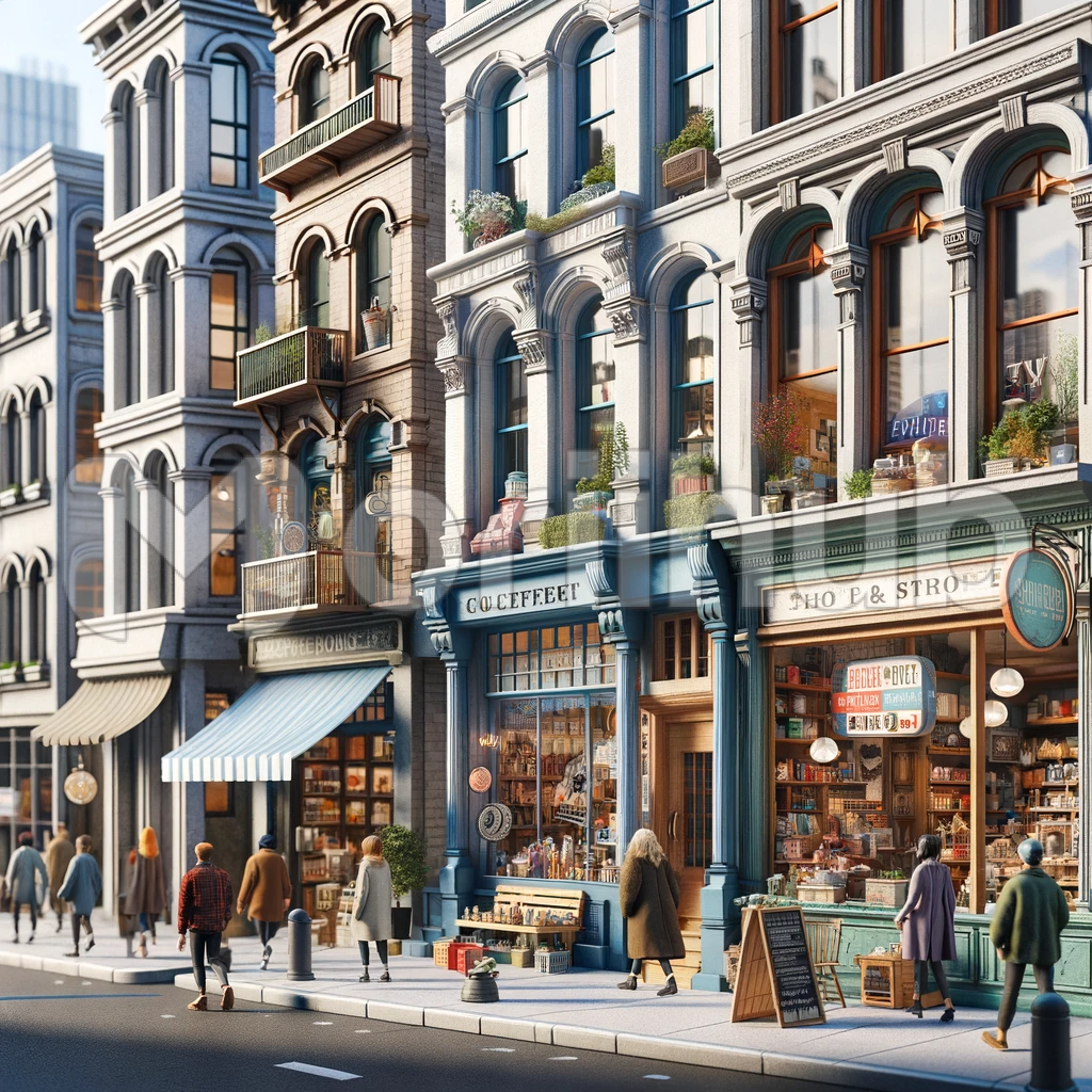 In this bustling urban street scene, the city comes to life with a delightful mix of diverse shops. Along the sidewalk, a charming cafe beckons with aromatic brews and pastries. Next door, a quaint bookstore invites exploration with its rows of shelves filled with literary treasures. Further down, a stylish clothing boutique showcases the latest fashion trends, its window displays catching the eye of passersby. The street is a vibrant tapestry of commerce and culture, where people of all walks of life come together to indulge in the pleasures of city life.