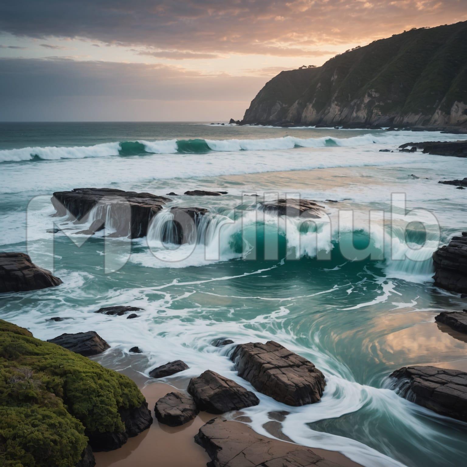 The tides crash rhythmically against the rugged rocks near the shore, their relentless waves creating a soothing yet powerful symphony of sound. The water foams and churns as it meets the jagged edges, sending sprays of white mist into the air. In the distance, a gentle hill rises softly against the horizon, its green slopes contrasting with the rocky coastline. The serene backdrop of the hill provides a tranquil counterpoint to the dynamic energy of the waves, creating a picturesque and harmonious coastal scene.
