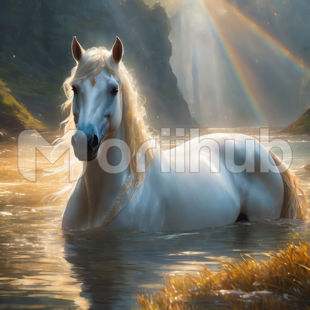 A magnificent white horse gracefully traverses a tranquil river, its powerful legs creating ripples in the crystal-clear water. Sunlight breaks through the mist, painting a vivid rainbow in the distant horizon. The horse’s ethereal beauty is accentuated by the surreal backdrop, creating a scene that melds the serene harmony of nature with the elegance of this majestic creature, a fleeting moment of enchantment along the river’s edge.