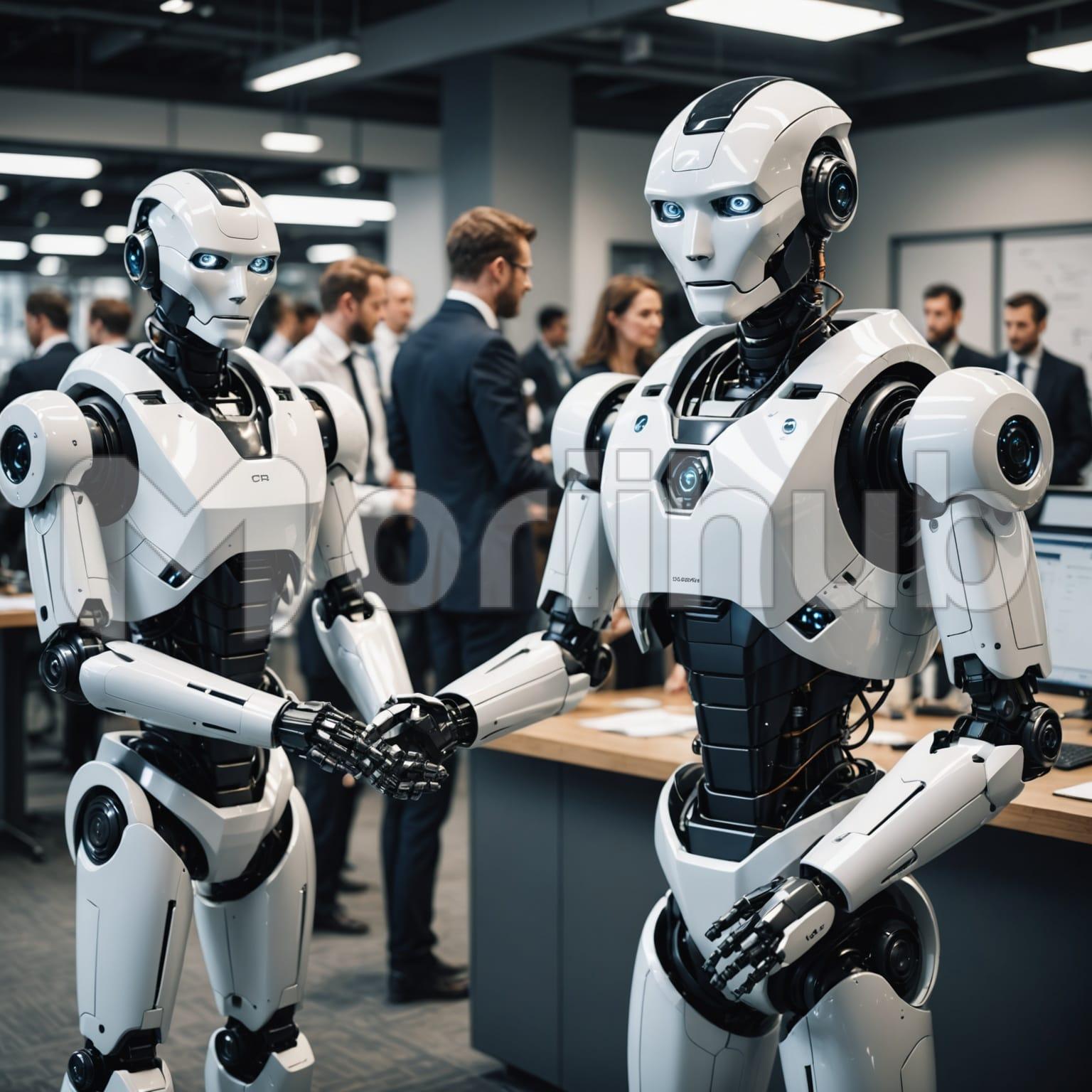 Robots stand ready in a sleek, futuristic office, programmed to manage and serve with precision. Their digital interfaces glow as they analyze data and make decisions, offering efficiency and innovation. With every task, they streamline operations and deliver results, embodying the future of management in a world driven by technology and automation.