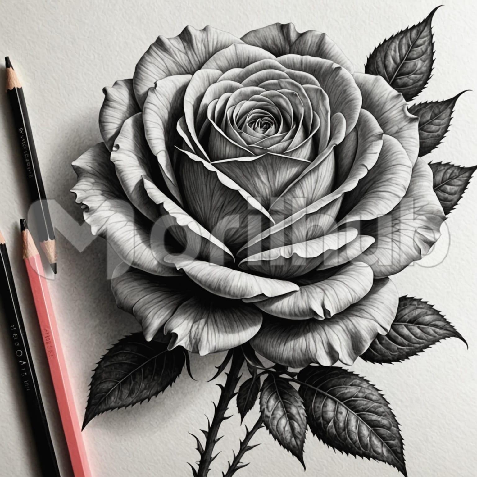 A sketch of a rose flower is seen on the page, drawn with clean pencil lines that define each petal in gentle, looping curves. The bloom is full, its petals layered outward from a tight center, gradually widening in form. A short stem supports the rose, with a few simple leaves near the base. In the corner of the page, pencils rest diagonally, their tips faintly smudged from recent use. The scene feels still and unfinished, as if paused in the middle of thought, with the flower holding quiet focus on the paper.