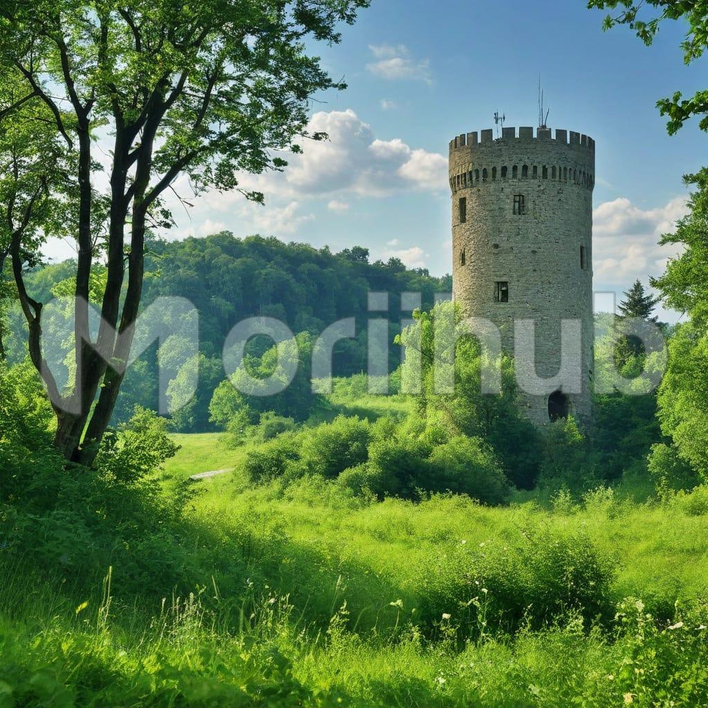 A round-shaped tower stands tall in the heart of a peaceful meadow, surrounded by the gentle embrace of nature. The soft curves of the structure blend harmoniously with the landscape, creating a serene scene. The tower, with its unique design, offers a perfect vantage point to admire the sprawling meadow and the endless sky beyond.