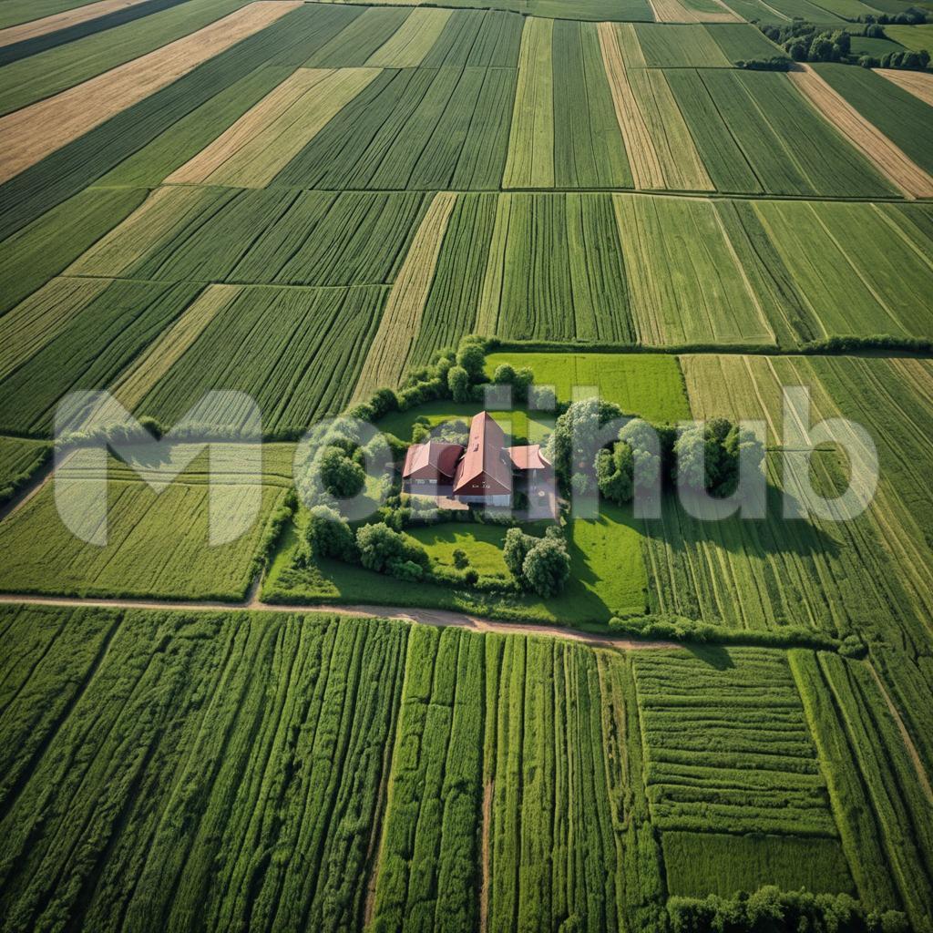 A picturesque view of farmland nestled in a serene meadow, with rolling green fields and patches of crops, surrounded by distant trees under a clear sky, evoking tranquility and rural beauty.